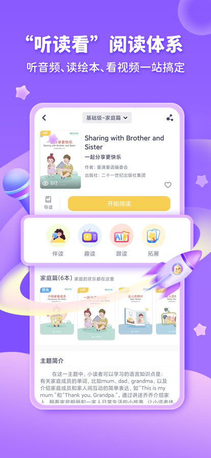 【APP介绍】 童伴成长APP是一款全场景化童书阅读服务产品,致力于带领小读者更好地领略童书世界,助力家长与宝贝开启一段温暖的亲子阅读之旅。 【APP精彩内容】 童伴成长的多元化内容,助力小读者读透一本书: · 原创双语互动绘本、双语音频剧 · 精选中文互动绘本、中文音频剧 · 阅读陪伴官讲解故事的视频 · 同龄示范发音视频结合AI评测 · 海外宝贝们真实日常生活情景视频 · 助力阅读输出的UU拍 绘本、音频、视频等内容不仅能时刻陪伴小读者成长,也是实体童书的配套电子内容,满足不同阅读场景。 【产品与内容特色】 1.高效阅读模式——实体童书与电子内容融合 2.阅读成果展示——打造一个阅读输出的舞台 3.地道双语内容——海外团队创作的日常故事 4.综合素养提升——培养情商逆商,科普知识 5.亲子共读时光——内容与模式适合亲子互动
