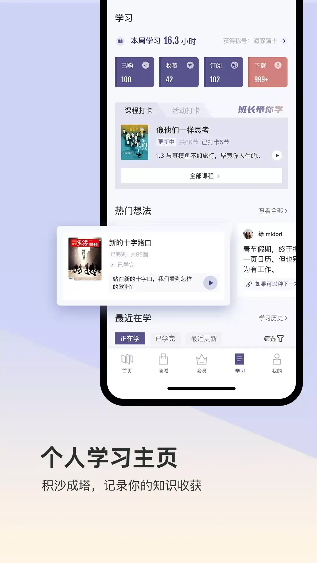 三联中读迎来了8周年生日,《三联生活周刊》也来到了第30个年头。在这个节点,三联大会员重磅亮相! 成为三联大会员,你将拥有涵盖线上和线下、实体和虚拟、图书、课程和杂志的全系列“三联出品”。我们希望为三联的老读者们,提供一份新鲜的线上知识库;希望带三联的新用户们,嗅闻那分传统的三联书香。无论哪种知识需求,都能满足。 【我们的品牌】 中读是《三联生活周刊》官方App,脱胎于国内文化类媒体资深品牌《三联生活周刊》。 依托三联深厚的人文知识储备,26年打磨沉淀,为用户提供读书新知、生活美学、艺术音乐、历史地理、心理教育等陪伴式知识服务。 【我们的团队】 三联中读团队中资深编辑做品控,平台内容品质有保障 出品课程由国内知名学者当中读主讲人,还有业内文化大咖做客中读开直播跟中读用户倾心畅谈。 【我们的好课】 三联中读出品的精品课多次入选知识付费TOP榜单,圈内口碑好 在第三方“知识付费平台排行榜”影响力排行中,“中读”入选TOP10,在“社科人文艺术”品类中,高居TOP1。 中读自制精品课《中国群星闪耀时》《我们为什么爱唐朝》《学会幸福》等获当月全网新课排行榜TOP5,引发