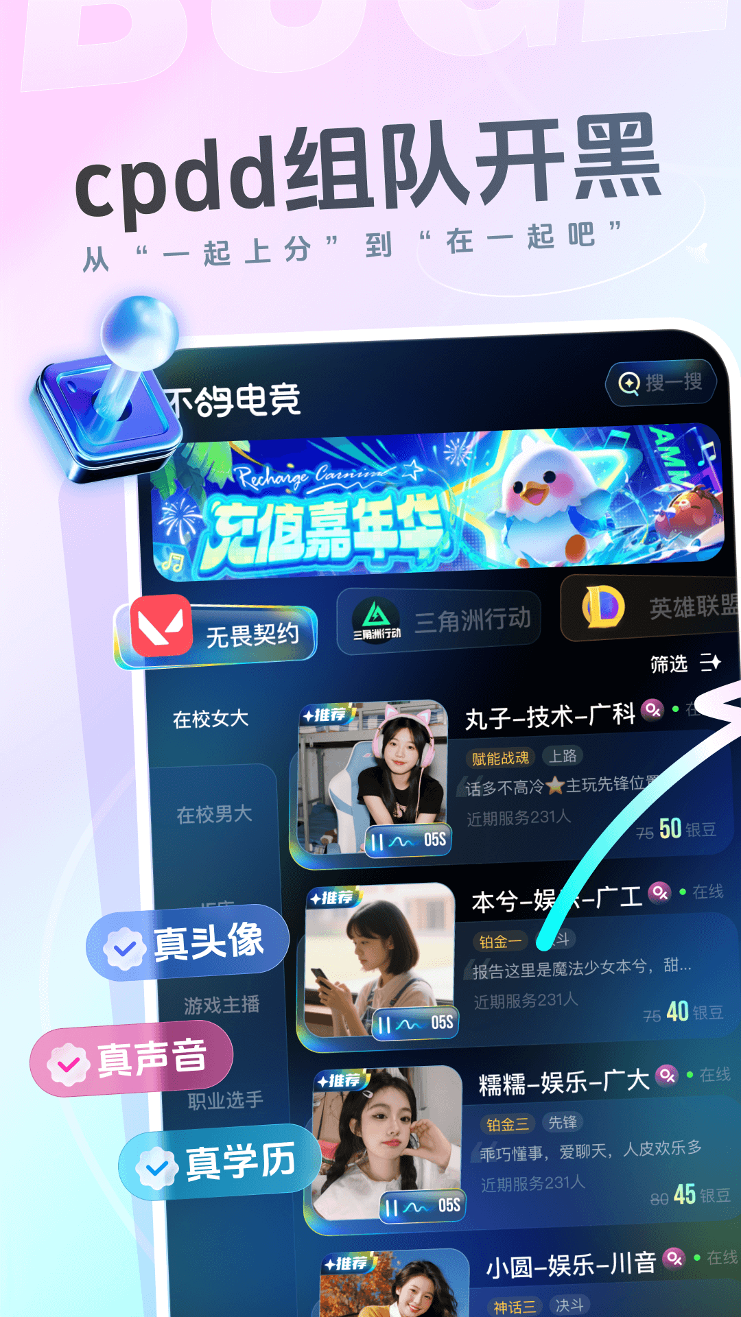 不鸽电竞,是一款全国领先的端游开黑社交APP,专注提供高质量陪玩与组队体验。这里是千万大学生玩家的聚集地,10W + 认证大学生陪练师在线等你,青春火力开黑场,组队 carry 嗨翻场,让开黑不止于竞技,更有心跳加速的默契碰撞,荷尔蒙飙升的趣味社交!<br><br>男大女大在线陪玩,趣味开黑嗨不停<br>大学生认证陪练师24小时在线,阳光男大 carry 全场的热血操作,清纯女大甜度超标的暖心陪伴,开黑全程高能不断!在肾上腺素飙升的对决里,青春荷尔蒙拉满,带你重返十八岁!高颜值学妹学弟,技术硬,情商高,无论是教学局、娱乐局,还是深夜聊天局,总有一款戳中你!<br><br>端游热血开黑 一键匹配优质队友<br>厌倦了手游的散人坑局?不鸽为你精选技术流端游“神仙队友池”——海量大学生、专业游戏主播、明星职业选手在线组队,任你选择。一键匹配大神,《无畏契约》《三角洲行动》《英雄联盟》等热门端游随心畅玩,告别孤单作战,和靠谱队友并肩冲锋,极致竞技,热血开黑!—— 这才是端游玩家该有的高质量开黑!来不鸽,找到与你同频的热血玩家。<br><br>真人派单专属服务,放心下单无顾虑<br>1V1 专人服务,不满意随时退单!交易安全 + 技术段位双保障,放心下单无顾虑~极速下单,无需等待,即刻连线心动队友!更有「声控福利」大放送 ——学妹音、甜妹音、御姐音、学弟音、霸总音、少年音、……各种优质声音任你选,开黑更带感!<br><br>多样玩法互动,欢乐交友升级<br>互动小游戏:桌球、你画我猜、飞行棋、拆弹达人…… 和好友随时组局,拼手速、比策略,给你带来无穷乐趣!<br>多人语音聊天室:连麦PK、心动交友、听歌点歌......在声音派对中,释放你的生活压力,找到有趣的朋友!用声音治愈你,交友就这么简单!<br><br> 还有更多惊喜等你解锁<br>装扮商城随心搭,头像框、坐骑彰显个性;<br>礼物图鉴记录互动瞬间,让每份心意都有痕迹;<br>贵族特权升级体验,在社交场变身亮眼存在!<br><br>现在下载不鸽电竞,一键匹配你的校园男神女神CP,解锁开黑连麦新体验吧!<br><br>我们希望得到你的反馈,如果你有任何问题、意见或建议,欢迎通过以下方式联系我们!<br>官方微博:@不鸽电竞APP<br>官方微信公众号:不鸽电竞<br>官方网站:http://www.bugegaming.com/