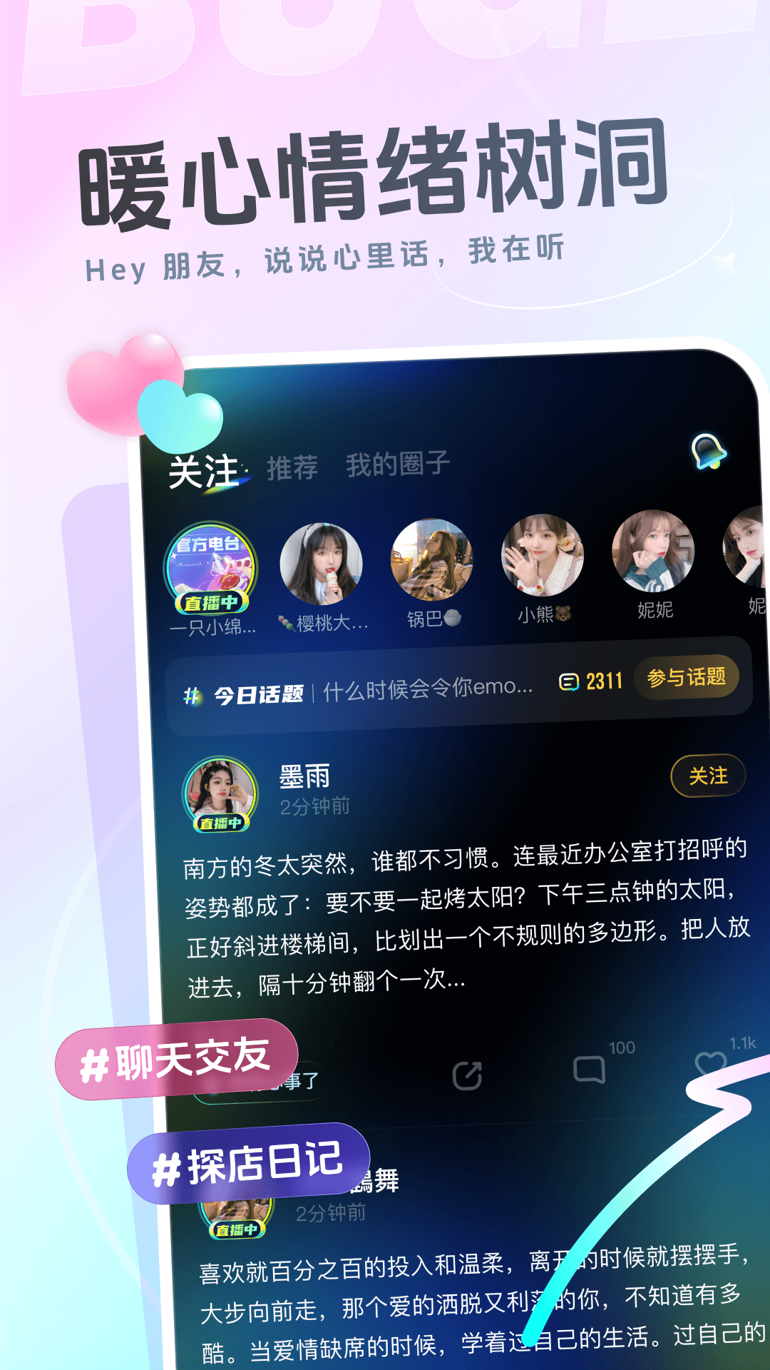 CUCU,专为女生打造的语音专属天地!<br>在这里,你可以尽情释放情绪、畅聊无负担,每一份温柔声线都经过精心筛选,只为帮你遇见灵魂同频的TA。<br><br>【女生专属】没有嘈杂打扰的纯粹空间!无论是想找闺蜜式搭子闲聊,还是要温柔陪伴,随时开口都有人响应,不用害怕冷场或被打断;<br><br>【声控福利】耳朵直接沦陷的心动时刻!他的一句轻声晚安、一首专属情歌,或是一段磁性读文,每一种声音都戳中声控喜好,像在耳边私语;<br><br>【暖心陪伴】每段情绪都能被认真接住!开心想分享时有人共鸣,难过想倾诉时有人倾听,总有温柔的声音守着你,不让情绪独自停留;<br><br>【真实心动】真人照片、兴趣标签全核验,不用顾虑虚假信息,你可以放心分享日常,和心动的他轻声聊心事、开麦畅聊;<br><br>【专属邂逅】轻松开启的美好可能!遇到合拍的他,不用纠结怎么开口,一次主动 say “hello”,解锁浪漫故事。<br><br>CUCU,让温柔声音成为你与美好连接的桥梁,开启一场浪漫线上之旅吧!