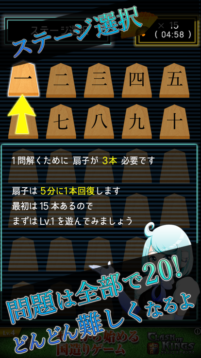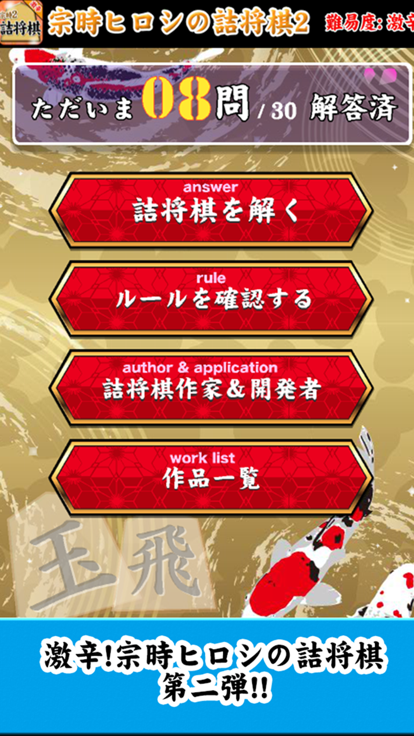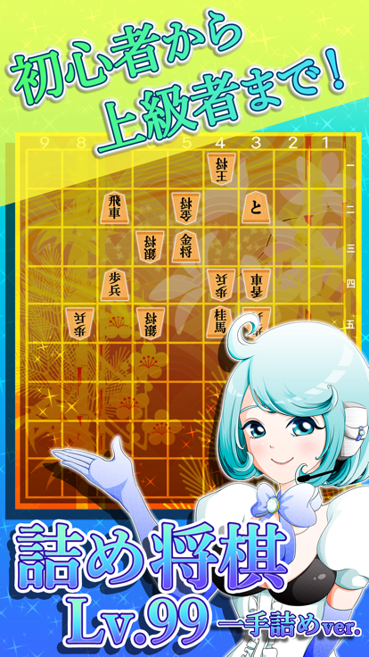 ◆◆◆全ての将棋好きが楽しめる詰将棋アプリ!◆◆◆ ◆◆◆難易度はなんと全部でLV99まで楽しめる!◆◆◆ ◆将棋アプリとは思えない派手な演出! 「将棋アプリってちょっと地味、、」というイメージを覆す派手な演出とグラフィックで将棋初心者の方でも飽きずに楽しくプレイ可能!! ◆初心者の方でも楽しくレベルアップ! 「駒の動きしか分からない、、」という方でも楽しめる! 「詰め将棋LV99」は最初はとってもカンタンな1手詰めからスタートしてほんの少しずつ難しくなります! なので1問目から全く分からずに飽きてやめてしまうことがありません! 99段階という極めて細かいレベル設定で問題が作られているため、 ゆっくりと段階的に確実に棋力アップできます! ◆どうしても分からない問題はヒントを使って攻略しよう! 何度考えても分からない問題については、思い切ってヒントを見てみましょう! 難しい問題もヒントを見ながら回答できるのでスラスラ進んで凄まじいスピードで棋力アップが期待できます! ◆上級者も楽しめる超難問も収録! 終盤はアマチュア有段者や奨励会の方でも「ちゃんと考えないと解けない」超難問が収録されています! 最後の問題はプロ棋士の方でも解答を導くのに1時間はかかる「究極の問題」が入っています! 腕に自身のある方の挑戦もお待ちしています!! ◉詰め将棋のルール 1.先手(攻方)、後手(玉方)が交互に指す 2.攻方は玉方の玉を詰ませる 3.攻方は必ず相手の玉に王手をかける 4.玉方は必ず王手をはずす手を指す 5.玉方はすべての駒を合駒として使用 6.玉方は最も長い手数になる手を指す 7.無駄合いはしない