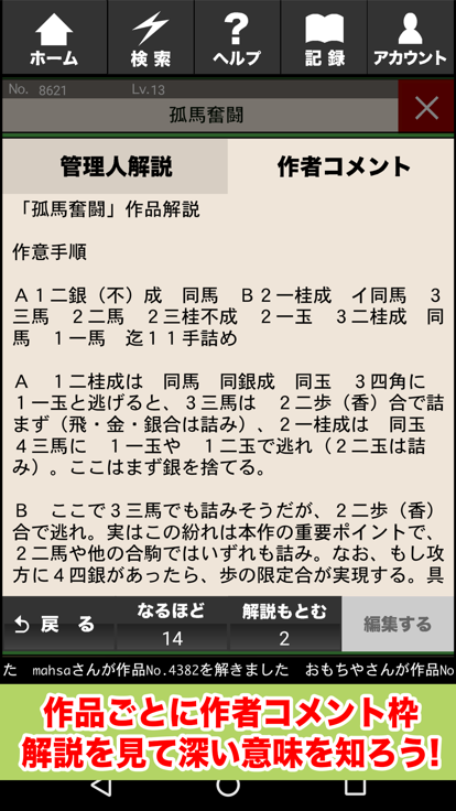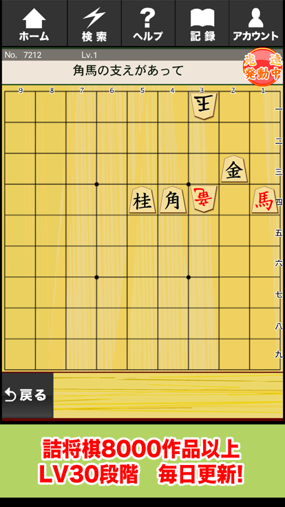 内容説明 7000個以上の詰将棋作品があり、毎日増えます。詰将棋を解いてレベルを上げると、より多くの作品にトライできるようになります。 それぞれ個々の問題でタイムアタックランキングとクリア順ランキングがあります。がんばってランクインを目指しましょう。 また詰将棋作品は毎日新しいものが更新されます。その際は「新着作品」に載せられますのでクリア順ランキング上位が狙えます。 注意事項 ・アカウントは絶対に消えません。WEB版からメルアド登録もできますし、管理人にメールまたは掲示板書き込みにて必ず解決することができます。レビューにアカウント消えたことを書いても全く解決になりません。なおゲストのままであってもアカウントとして生かされます。 ・チュートリアルが終わらない場合はiPhone端末の空き容量が足りてない、もしくは通信できない状況である可能性があります。 --詰将棋作家様-- ご協力いただいた作家様は330名です。今後とも宜しくお願いいたします。(敬称略) 須藤大輔 kazemidori EOG serisiu 幻想咲花 ブルータス ゴルゴ40 ストンリバー 市原誠 世阿弥(山川悟) がもうの munetoki(宗時ヒロシ) ワイトキング 佐口盛人 やきのり アライモン スドファエ 風鈴 火星人11号 Ford えったん FD3S はらちゃん 白薔薇 将一 Mr.T はじめ RedFive クレア GEDZI 后 田舎娘 tkhr 暁人 kokoro ぜぶ はかせ わたこう EAGLE 木原主将 caipirnha よしみち クマー SEN ジョーマ 藤堂ひかる 輝 koe1 駿河 直之 将棋壺 名のない少年 なるぞうくん グリーンシューター 馬さん すが ひジキ ポ (´・ω・`) toniong 魔太郎 カッチン アキラ 酒のほそ道 老島正 SAM 名無。 てん はるお ITTO@ 蓮根うまー ジル mainasu5 Dr.nasu torutanika ゴッドガンダム デイジー 竜王 しょこ スコット少佐 パスファインダー 3.14 ほうれん草 ささおか 名無し名人 3.141 Agj ∞零∞ 執行者 りゅうた レガシー ツバサ パンチョ ORANGE soga_I tdk1986 河西 隆徳 ヌーボ dongurik カルビー しょうゆ 新手一生 SHANTY ぼかか お疲れサマンサタバサ Fairytail 飛角銀桂の攻め 矜羯羅童子 Aineias きょう ダ・ヴィンチ 雀鷹 カレン ぽぽぽぽーん 960666 るなてぃっく yoshi-take 迦南 黄色 yuki マハロ 範馬人志 yuki 天ヶ瀬朔也 孔明 獅堂 さすらいの詰キスト イカ娘 Fe 裕一 クンナースーパーよっし0 鰻屋 soga_I モコナ nori ほか --操作方法-- (1)詰将棋を解く 自分のレベル以下の作品に挑戦できます。 「挑戦」:レベルと状態(未解答、解答済、閲覧済)から検索して作品を選べます。 「作品一覧」:すべての作品から選べます。 「おすすめ作品」:自分のレベルに合った未解答作品が出題されます。 「新着作品」:新しく更新された作品が出題されます。 (2)詰将棋を評価する 詰将棋を解き終わったら、作家さんたちへの感謝を込めて作品に対して評価してあげましょう。星は1つから5つまでつけられます。 またブックマークをつけると後からわかりやすくなります。 (3)詰将棋を確認する 右上の「記録」から解いた作品を確認できます。良い作品はもう一回見てみたいですね! (4)イベントに参加する フェステボというものがあります。10問連続して解答してタイムを競います。クリアタイムが設定されてますので、そのタイム以内に解答し、且つ15人以内であるなら旗をGETできます。 旗を集めて詰友に自慢しよう。 (5)創作する レベル7以上になると創作が可能になります。詰将棋を作って管理人に送ることができます。 余詰チェックなどの後採用通知が来ますので、もう一度採用してもいいかの判断ができます。ここで採用してよいなら「YES」ボタンを押下してください。 50問以上作ると単体アプリになって作家デビューすることができます。 現在、市原誠さん、世阿弥さん、がもうのさん、munetokiさんの単体アプリがあります。 --詰将棋解答ルール-- (1) 攻方は王手の連続で玉を詰ますこと (2) 攻方は最短最善手順で玉を詰ますこと (3) 玉方は最長最善手順を選んで逃げること (4) 攻方の持ち駒以外の駒は玉方が使用できる (5) 攻方は詰手順中の入手駒を使用できる (6) 他は全て指将棋のルールが適用される (6-1) 二歩を売ってはいけない (6-2) 打ち歩詰めは禁手(突き歩は可) (6-3) 行き場所の無い駒は打てない (6-4) 王手の千日手は不詰 (7) アプリ内でのこと (7-1) 同一局面王手があった時点で不正解 (7-2) 最終手にて、3手以上かけると不正解扱い --詰将棋創作ルール-- (1) 玉が詰むこと (2) 正解手順が1通りであること ※攻方に2通り以上の手が発生しないこと ※玉方に2通り以上の手が発生するのはOK (3) 最終的に駒が余らないこと (4) 詰みに無関係な駒がないこと (5) 最終手に余詰があっても許容される ※一手詰作品の場合は許容されない (6) 他は詰将棋のルールが適用される (7) 左右対称形の場合左右の2通りの詰方があっても余詰としない --本アプリに於ける採用基準-- (1) 上記創作ルールに従っていること (2) 香飛角による非限定打は許容範囲 (3) 成不成による非限定は許容範囲 (4) 最終手作意以外の手順発生は許容範囲 (5) 迂回手順の発生