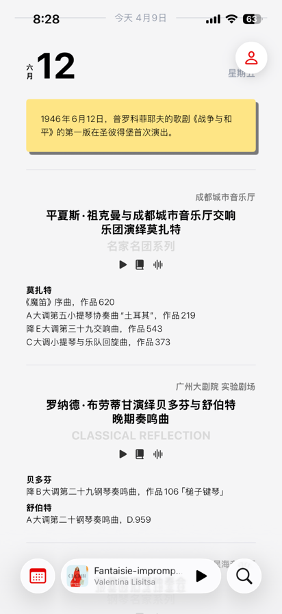 邂逅好听的作品,听见每一场演出。 浏览国内外已公开的古典音乐演出安排,直接聆听每一场演出的曲目,并通过节目册、播客等额外的内容来了解曲目,既可以为将要前往的演出做好预习功课,也可以为无法前往的演出弥补些许遗憾。 由响声播客团队设计与制作。EULA: https://bwv988.com/terms