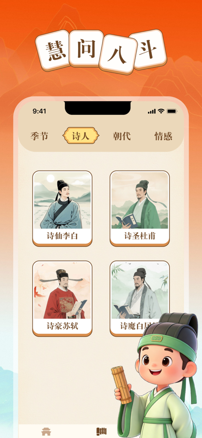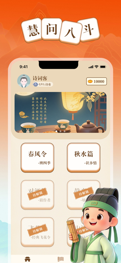 《春风令》以季节为令,带你漫步唐宋诗人的四时光景: 春:一夜春风来,千树万树梨花开 夏:接天莲叶无穷碧 秋:停车坐爱枫林晚 冬:北风卷地白草折 经典诗句化作互动关卡,猜字、判断、填空,在「得之!」与「惜乎~」之间,不知不觉记住更多好诗。 核心特色 原创季节诗词闯关体系 按季节·诗人·朝代·情感多维度诗词库 每日打卡 · 成就解锁 · 轻量知识积累 诗通江海 · 词越春秋,遇见更好的自己 无论你是准备诗词大会、想陪孩子亲近国学,还是单纯喜欢古风文艺,这里都有一首诗,在等你。 下载慧问八斗,让我们一起 在春风里相遇李白 在秋水中重逢苏轼 在雪夜里听见岑参