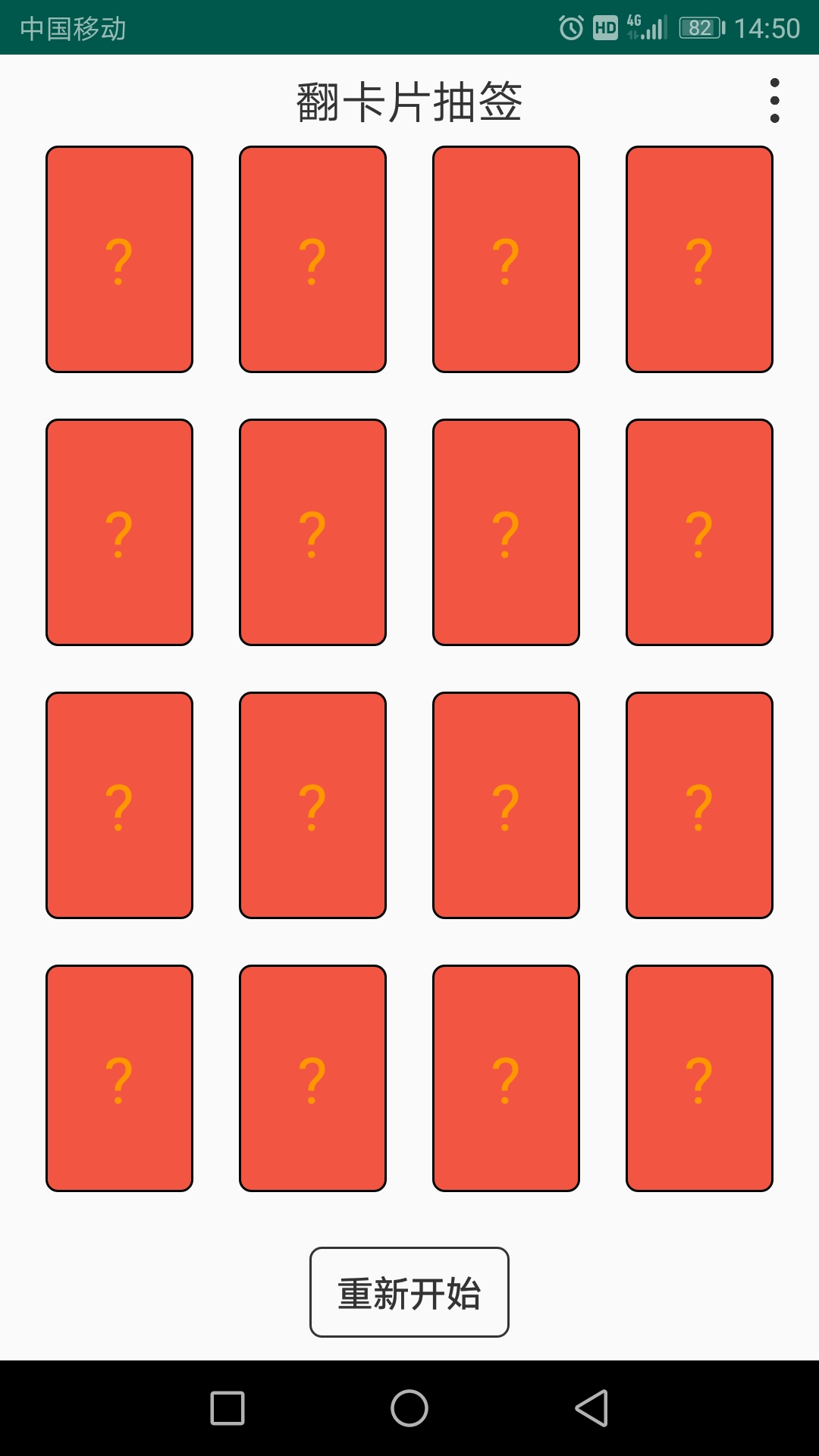 【软件介绍】 <br>翻卡片抽签app是一个好用给力的翻卡片抽签工具,它利用翻牌系统来决定随机抽取人员的功能,可以用在一些活动和办公场所中。 <br>和我们想象的一样,只要点击卡片才能知道后面的内容或名字。 <br>卡片未被翻开时,此时只能看到卡片的背面,卡片正面的内容被隐藏;点击卡片的背面,卡片自动翻开,此时显示卡片正面的内容。卡片的背面是看不到任何内容的,只有翻过来看正面才能了解卡片信息。 <br>【功能一览】 <br>卡片正面的内容和卡片的数量都可以简单的人为设定,卡片的背面可以自己选择和定义背景颜色。 <br>翻开一次后就可以立即重置洗牌,不可能作弊,能保证公平公正。 <br>【软件特色】 <br>玩真心话大冒险吗?用它来翻牌抽签是最合适不过了,使用方法很简单。 <br>翻卡片抽签主要适用于一些需要挑选随机人员的场景,比如要选人表演节目或者进行抽签活动等等,随机性极大。 <br>当你在各个选择中犹豫不决的时候,就可以使用翻卡片抽签app,帮助用户快速做出选择,也可以和多个用户一起玩,是聚会玩乐必不可少的软件哦,需要的朋友快来下载吧。