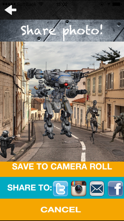 ***超现实的机甲显示在你的照片! *** 你可以把一个未来技术的机器人的战场图片在几秒钟!只需轻点几下,你可以在你的照片显示各种逼真的机甲。 享受超过60台机器!该应用程序包含了许多未来的机器,如人形机器人,巨型机器人,机器人侦察,昆虫型机器人,航天器,太空战机,不明飞行物,装甲车辆,武器,士兵,导弹等。 当然,你可以分享到Facebook,Twitter或Instagram的照片。而且还可以通过电子邮件将照片发送给你的朋友。 如何使用: 第1步。捕获或导入照片 第二步。选择机器 第三步。旋转和调整机器,以适应 第四步。保存或分享! 产品特点: - >专业设计的机甲和武器 - >旋转 - >调整 - >超过60台机器 - >使用现有的照片或拍摄新镜头 - >分享您的照片 - >保存到图片库 有一个有趣的!
