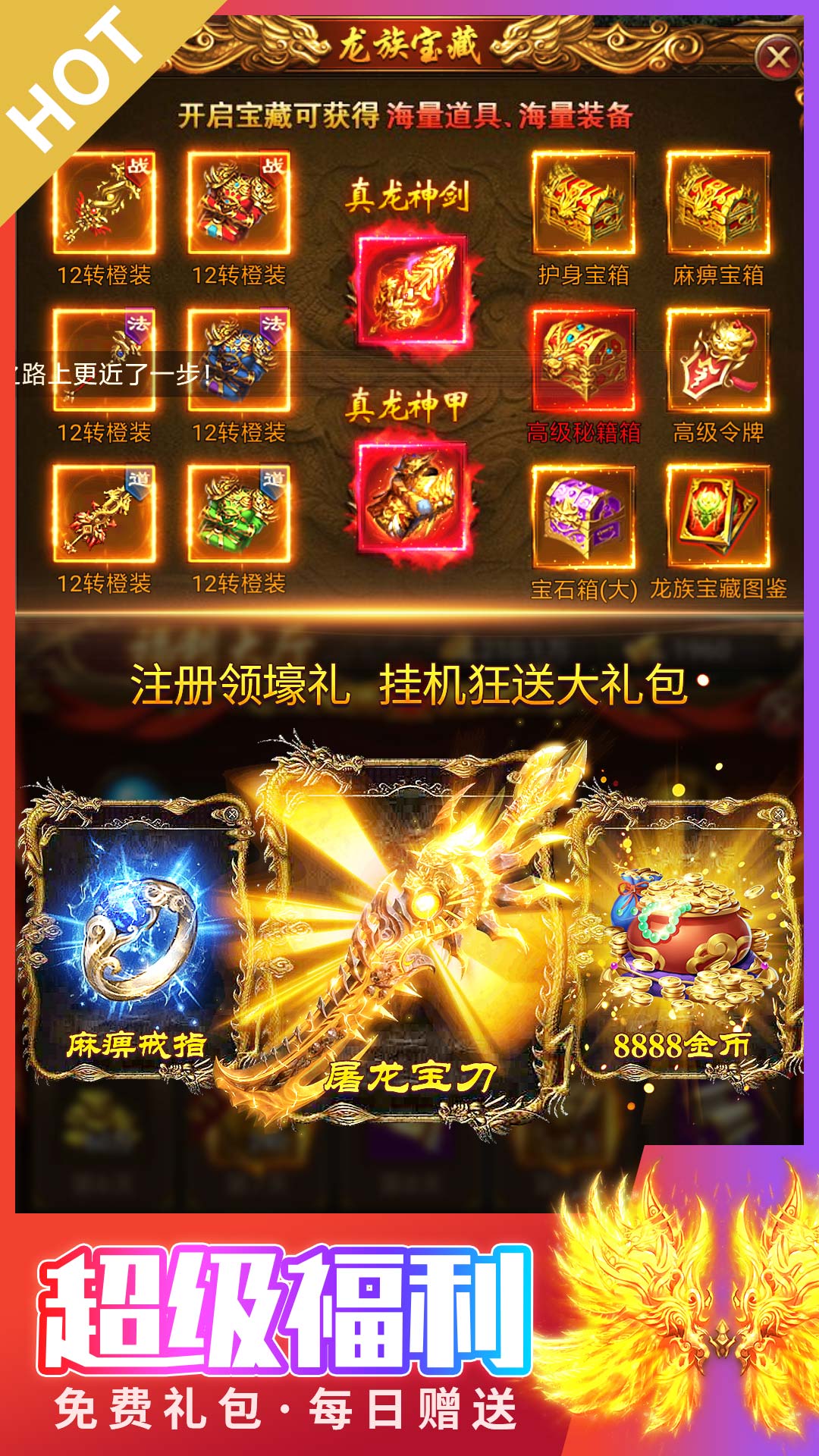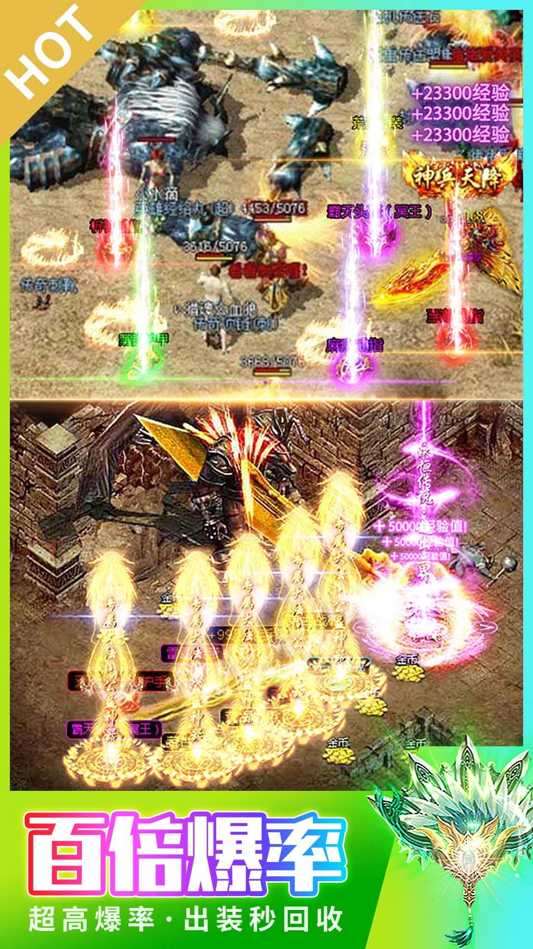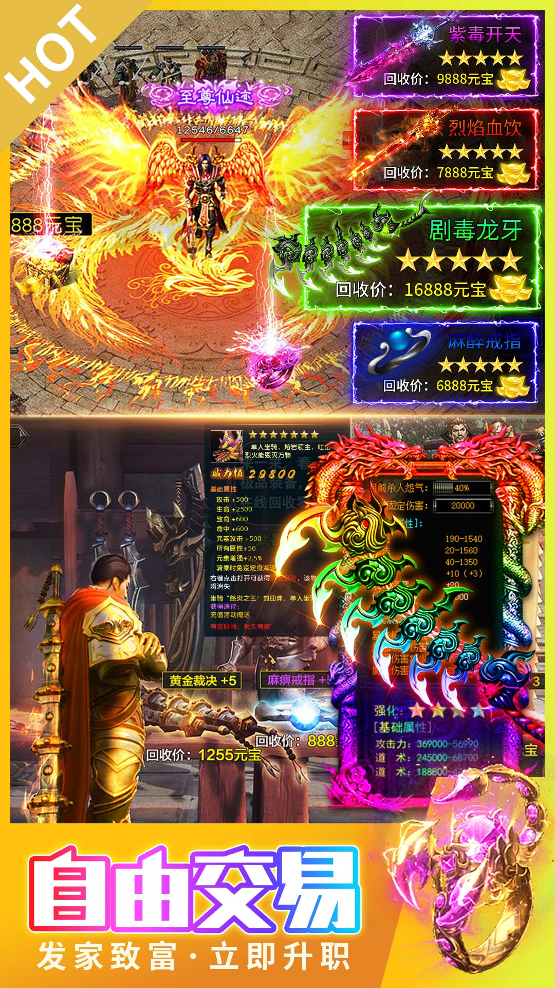 开局攻速拉满,全地图无限制,远古BOSS随心砍,小怪也爆终极。挂机超多福利,平民不氪不肝也能免费升级VIP,海量装备拿到手软,多种奖励让你战力一路飙升。增加了跨服决战、勇闯天关、圣兽领域、巅峰争霸、群雄逐鹿等多种精彩创新玩法,让玩家既能体验经典又能有不一样的传奇体验~<br>游戏特色<br>【装备保值,超高爆率】<br>装备全靠打,神装保值,装备全可回收元宝,可越级打宝,爆率超高,不氪不肝体验好。<br>【解放双手,自由交易】<br>金币装备自动捡,挂机升级打宝两不误,特色公平的自由交易系统,完美平衡商人与平民的利益。<br>【万人攻城,血战到底】<br>经典还原热血攻城玩法,万人同屏激战,让你回到那个激情的青春岁月,一统沙城得天下。