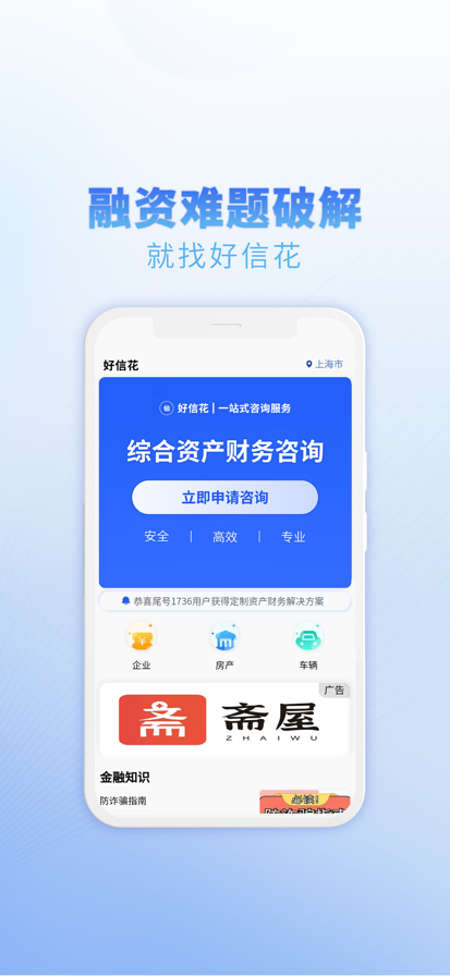 好信花是一款一站式的资产财务重组及负债资产资咨询服务平台,致力于为您提供全面、专业且精准的综合化资产、房产、车辆和企业资产负债重组和资产负债咨询服务。 综合化资产咨询: 无论是个人的多元化资产组合,还是企业的复杂资产结构,好信花都能凭借其专业的团队和丰富的经验,为您进行深入的分析和评估,提供资产财务负债优化建议,助您实现资产的保值增值,缓解资产负债压力,增加财务现金流通。 房产财务咨询: 在房产领域,主要在按揭房产、房产抵押策略、房产置换等,好信花为您提供全方位的指导建议,让您在房产决策中更加明智、稳健。 车辆财务咨询: 无论是购车预算规划、车辆贷款方案选择,,好信花都能为您提供详细且实用的咨询,确保您在车辆相关的规划决策上做出最优选择。 企业财务咨询: 针对企业,好信管家提供专业的财务战略规划、企业融资成本控制、企业融资后资金管理等咨询服务,助力企业提升融资财务水平,缓解企业成本、企业资金压力,增强市场竞争力。 需要特别强调的是,好信花的服务范围不包含债务优化和投资理财。我们专注于上述核心领域,以确保能够为您提供最专业、最深入、最具针对性的咨询服务和解决方案。 选择好信花 APP,就是选择了一位贴心、专业的财务咨询伙伴,让您在复杂的财务世界中,始终保持清晰的方向和稳健的步伐。