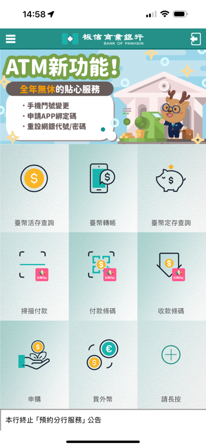 「板信行動銀行APP」提供您臺幣(非)約定轉帳、臺(外)幣帳戶餘額及交易明細查詢、基金投資損益查詢、結購(售)外幣、快速登入設定、臺(外)幣利匯率查詢等服務,您可隨時進行帳戶明細查詢及轉帳交易。 「板信行動銀行 APP」功能總覽: 【臺幣存款服務】臺幣活存查詢、臺幣定存查詢、跨提/跨轉優惠次數查詢、臺幣轉帳、預約轉帳、預約轉帳查詢/取消、臺幣做定存、臺幣定存查詢變更、臺幣綜定存中途解約、預約臺幣定存查詢/取消、託收票據查詢、本日支存不足查詢、約定/常用帳號查詢及編輯。 【臺幣放款服務】放款明細查詢、放款應繳本息查詢、貸款本息繳納、貸款還本。 【外匯服務】外幣優利定存(以外幣轉存)、外幣優利定存(以新台幣轉存)、外匯活存查詢、外匯定存查詢、買外幣、賣外幣、外幣轉帳、外幣綜活轉存綜定、外幣綜定存中途解約。 【風險屬性評估】測驗投資風險接受程度。 【基金服務】基金損益查詢/轉換/贖回、基金申購、預約交易查詢/取消、基金歷史交易明細查詢、基金投資條件變更。 【海外股票/ETF服務】買進、庫存總覽及賣出、委託查詢/刪單、歷史交易明細。 【轉帳繳稅(費)】轉帳(掃碼)繳稅、轉帳繳費。 【台灣Pay(行動繳稅)】掃描付款、付款/收款條碼、掃碼繳費、稅。 【行動專區】手機門號認證、綁定碼認證、變更行動專區開啟密碼、重新取得交易確認訊息、離線動態密碼、裝置綁定刪除。 【設定服務】快速登入設定、快速登入裝置刪除、使用者代號變更、網銀密碼變更。 【利匯率查詢】臺幣利率查詢、外幣利匯率查詢。 【銀行服務】客服專線、分行查詢。 【金融友善銀行】臺幣帳號總覽、臺幣交易明細查詢、臺幣約定轉帳、臺幣非約定轉帳、使用者代號變更、網銀密碼變更、利匯率查詢。 板信商銀提醒您,建議安裝防護軟體以提升您的行動裝置安全性。