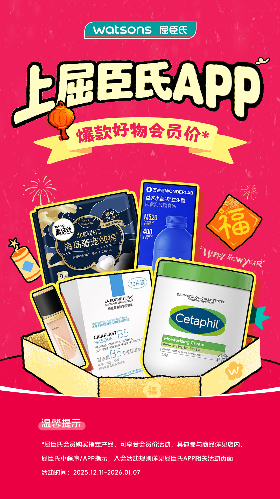 屈臣氏APP全新改版,足不出户也可享受门店优惠活动了!美妆个护正品,快至30分钟闪电到手,更快更方便!<br>屈臣氏百年品牌信誉,正品保证,精选宝洁、联合利华、施华蔻、妮维雅、春雨、森田等知名品牌,提供从护肤、美妆、美发、日用、个护、零食等全方位产品选择。<br>【闪电送&门店自提】<br>-美妆个护正品,快至30分钟闪电到手,优选附近门店发货,拒绝等待<br>-线上下单,门店自提,随到随取,放心又快捷<br>【会员专享好礼】<br>-每月25号云店宠粉日:会员享受100积分抵25元,6倍积分抵现<br>-羡煞旁人的会员特权、积分兑换,给你 C 位的尊贵<br>-发现万人亲测的口碑好物指南,跟着买准没错<br><br><br>——屈臣氏品牌——<br>屈臣氏始创于1841年,线下门店覆盖全球12个国家地区,超过5500家门店。在中国,400多个城市已超过3600家门店,6500万名会员与你一起放心买好货!<br><br>【联系方式】<br>全国客服:400-830-1310<br>官方网站:http://www.watsons.com.cn/