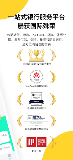 ZA Bank 是受监管的香港持牌银行,更是香港第一间开业的数字银行。ZA Bank 致力打造一站式的银行服务平台,包括转账、存款、ZA Card、贷款、外币兑换、海外汇款、保险、股票 、基金等投资服务都能一 App 完成,同时提供获业界权威奖项认可的商业银行网上平台!<br><br>体验与众不同的银行服务 <br><br>ZA Card - 香港第一张由你自订卡号的 Visa 扣账卡 <br>全港首创自订卡号的 Visa 扣账卡(debit card),真正与「众」不同。更可申请实体卡!实体 ZA Card 上无 CVV 及到期日,减少被盗用的风险。<br><br>年中无休,最快 2 分钟*开立 ZA Bank 账户 - 真正 24 x 7 全线上银行,助你随时随地轻松处理所有银行服务!<br><br>更多关于 ZA Bank 的服务及产品介绍可浏览 bank.za.group。 <br>*开立户口所需的时间取决于实际情况而定。一般而言,在无需提交额外资料的情况下,用户最快可于 2 分钟内完成户口开立。<br><br>此外,为提升互动体验,当你在 ZA Bank App 参与推广活动、互动游戏或使用相关功能时,我们可能从你的装置收集以下数据:仅限「读取步数」数据。<br><br>iOS 端在你登入并授权后,会从 Apple Health(HealthKit)或「Motion & Fitness(动作与健身)」同步步数,其数据源可能包括 iPhone、Apple Watch、兼容的穿戴式装置,或已接驳至 Apple Health 的应用程序。<br>Android 端在你登入并授权后,会从你选择的应用(如 Health Connect)同步步数;你可将穿戴式/健身装置连接至该应用以进行同步。<br><br>最小权限及用户控制权:我们仅会申请「读取步数」的必要权限,不会读取心率、睡眠、位置等其他健康数据。你可随时于装置设定/健康平台撤回或调整授权,亦可在 App 内关闭相关功能。若你未授权或已撤回授权,步数将不会再被同步,部分互动活动功能可能因此受限,但这不会影响你使用 ZA Bank 的任何核心银行功能。我们仅将步数数据用于上述互动体验功能,不会用于个人化广告推送,并采用业界标准的保安措施保护。详情请参阅《私隐政策》。<br> <br>本银行移动应用程式(「应用程式」)由众安银行有限公司(「ZA Bank」)提供,仅供现有 ZA Bank 的客户或持有有效身份证明文件并在提供居住地址的人士使用 (「客户」)。 如果你没有有效的身份证明文件和居住地址,或者(如你位于香港境外)你不是现有的 ZA Bank 客户,则不要下载此应用程式。 本应用程式及其提供的信息不供任何司法管辖区的任何人下载或使用,因为法律或法规不允许此类下载或使用。 任何非客户下载和/或使用本应用程式,将豁免 ZA Bank 因非客户任何不当行为或不遵守此适用的程式和指示引起的任何责任赔偿,损害,损失,支出或费用。 <br><br>ZA Bank 在任何其他司法管辖区无权或授权提供通过本应用程式提供的产品和/或服务,也不声明或保证本应用程式的内容适合或可供香港境外使用。 你有责任找出这些限制并遵守这些限制。 在使用本应用程式或我们的服务之前,请确保你遵守适用于你的当地法律和法规。 <br><br>本应用程式不应视为传达任何邀请或诱使从事银行或贷款,或任何要约或招揽向任何不合法的任何人提供此类要约或招揽,或当地法律或法规不允许此类活动或使用此类产品或服务。 通过本应用程式申请任何产品和/或服务,即表示你声明并确认你遵守适用于你使用本应用程式或我们服务的当地法律和法规。