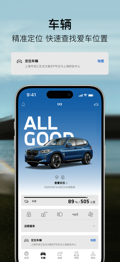 My BMW App为您提供数字化一站式全用车服务方案。 在 My BMW App中,您可以享受到以下内容: · 发现:与车友分享您的驾程体验,了解新的BMW 官方资讯。 · 车辆:帮助BMW新车主一键激活互联驾驶服务。远程访问并管理您的爱车,轻松调节车内温度,便捷查看剩余油量、充电状态和续航里程等重要信息,驾程状态尽在掌握。 · 地图:为您提供附近的停车场、加油站或充电站位置,并将目的地一键发送至您的爱车。 · 悦购:提供全方位用车服务,在线完成服务预约。轻松访问电商平台,新车商城、售后商城、互联驾驶商城。 · 我的:管理和查看您的个人信息主页,积累My BMW Joy币,享受精美礼品及服务礼券兑换。 即刻下载My BMW App,开启全新旅程! *请悉知 My BMW App适用于2014年及以后生产的车型,请通过您的具体车型配置和您的互联驾驶合同查看适配功能。 部分功能尚未开启,需在之后更高版本的My BMW App中使用,部分功能可能受到不同国家/地区的限制。