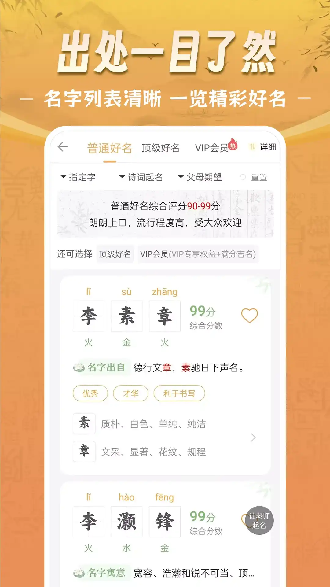 2025美名福名出炉,好听好记,气质独特!300万优选名字库!新用户享免费好名! 【精选高分佳名】筛选90-100分好名,彰显宝宝气质与个性 【九大维度解名】基础分析,名字含义,姓名学解释,名字出处,五行分析,数理笔画,字形分析,读音分析,流行程度,还有名字印象,细节评分,综合分数,让你全方位了解名字寓意 国学文化起名,满足父母期待: 【诗词来源起名】选择名字出处:来自唐诗宋词,名句名篇,诗经楚辞,四书五经,描写自然景物的诗词 【名字出自哪个诗人】可以设置多个诗人名字,从他们的文学著作中遍查好名 强大个性筛选,满足多种取名需求: 【指定字筛选】可以指定某字起名,过滤忌讳字,含有某字起名;还可以设置字的属性,偏旁,音调,笔画,书写,结构 更多惊喜功能: 【起名字典】提供多种起名工具,可以成语起名,自然事物起名,英文起名,双胞胎取名,4字取名,二胎取名,取小名等,也可以查看名字的典籍出处,同名人数,全国重名排行,汉字含义,文言文查询,五行和笔画查询,字母查询,韵母查询 【诗词起名】通过某个诗人,诗名,诗词类型,一键生成名字 【人工起名】一对一起名 【测名解析】测试打分