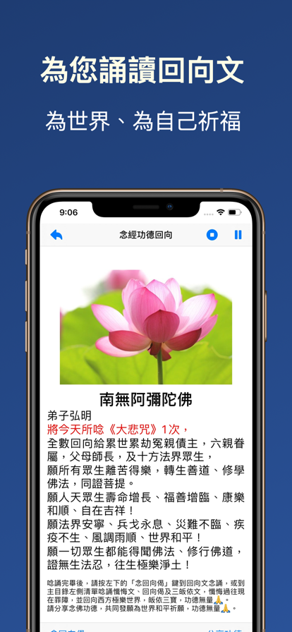 1. “粤语大悲咒”念佛程式现提供粤语、粤语仿梵音及国语三种语言。“粤语大悲咒”在汉字经文文字及粤语部分的注音以《三经合刊》版本为依据,梵音部分的经文来自网上资源。末学为梵音大悲咒配上最接近梵音的粤音,末学并为此配上最接近发音的粤字注音,以方便用家跟着念诵。 如果您在念诵的时候需要参考注音,可以在主页面底部的右下角点击“显示注音”。 2. 本程式会以您的名称及念佛次数,自动产生回向文。首先请您输入姓名,假如之后需要更改,请点击主目录左侧的小目录“重设念诵者姓名”。程式会纪录您当次及总计念诵次数。 3. 在这个版本(版本4.0)修订“设定次数”功能的位置。您可以按“+”、“-”键选择想念诵的次数,并按中间的数字以设定程式念诵的次数,再按右上角的三角形播放键。当数字显示红色并附上蓝色底色,显示“设定某次”或“剩余某次”,这样“粤语大悲咒”念佛机会在您播放的时候,自动按照你选择的次数念诵,并在完成念诵后自动以您的名义回向。 您设定的次数,将会纪录在系统中,成为日后默认念诵次数,下次念诵时,如果想以您上次设定的次数念诵,仍然需要按右上角的“次数设定”,再按播放键。 假如您已经设定了播放次数,播放中途离开后,可在当日再返回页面念诵,继续播放剩下的次数,无需再按“次数设定”键。剩余次数会在每日零时清零。 如果您没有选择念诵次数,当您完成念咒的时候,请点击播放键下的“最后一次”,待咒念完毕后,也会自动开启大回向文页面,并自动播放回向及发愿文。 4. “粤语大悲咒”介面右上角的三角形键是播放及暂停键,圆形是停止播放键。在播放期间不能设定念咒次数,但可以重设念咒次数。 5. 本程式提供背景播放功能,“粤语大悲咒”程式可以在您关闭屏幕下继续念诵咒文而不会中断。 6. 本程式设有“功德回向”功能,只要您在当次开启程式有念咒纪录即可按主页面的底部使用这个功能。在页面可以以这次念经的总功德回向及发愿,以及按底部的“分享念佛功德”,把这次您念佛的纪录通过各种通讯程式向朋友分享,可以直接分享,也可以透过程式已经设定好的复制文字,在网站贴上您今次的念佛纪录,共同为自己及世界祈福。 7. 本程式同时新增了纪录当次念佛次数及总计念佛次数。当您跟着程式播放完成一次念诵,将会自动增加次数,总计念咒次数将永久保存。至于“今天念经次数”由每天零时起打开程式起重新计算。 本程式自动纪录每日念诵不同咒的次数,供日后参考及回向,可以在主页面底部查阅过往念诵的纪录,并均设附带回向文的分享功能,欢迎您与好友分享。 8. 在念咒前念诵圣号的时候,本程式提供观音圣像,供用家观赏礼佛,并在念诵《大悲咒》时,按照法会念诵方式加入磬的音效。 9. 为了获得更好的念经功德,当念完经后,可以点击主目录的左侧目录中的忏悔文、回向文及三皈依,忏悔自己以往及现在的过错,并回向给累生累世的冤亲债主,超渡他们离苦得乐。 在这个版本(版本4.0)在“念经功德回向”、“忏悔偈”、“回向偈”及“三归依”页面,增设以国语念诵的选项。可以点击右上角选择您需要使用的语言。 10. 本程式也包括新增分享程式功能,在使用若干次后将会提示分享程式,敬请把此程式分享给你的家人亲友,广传经文,共同念诵,功德无量。 本程式也设有为“粤语大悲咒”程式评分功能,敬请给予评分支持及对程式提供宝贵意见。