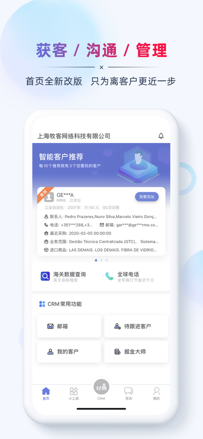 AB客 - 市场领先的外贸企业客户管理神器,一键获取海量国外客户,助力中国外贸企业销售效率提升。 产品特色: 【CRM管理】 从线索到商机,优化销售流程,高效跟进客户,提高团队管理效率,销售流程一体化管理;随时随地跟进客户,快速录入客户最新动态;手机也可以方便地浏览,查看,编辑客户信息。 【邮件管理】 邮件数据多端实时同步更新,新邮件提醒,及时回复客户邮件,锁定每一个商机;联系人卡片,帮助快速识别客户类型,聚合往来邮件,转化邮件线索。 【报告看板】 销售业绩数据,客户跟进情况,一目了然;智能身份识别,业务员查看个人业绩数据,管理者查看团队销售数据。