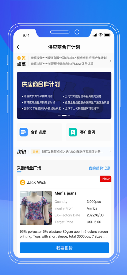 “贸点点”是浙江先合信息技术有限公司开发的专业外贸B2B服务平台,致力于为外贸供应商、海外采购商提供包括外贸订单达成、外贸询盘/询单对接、产品品控检验等国际贸易第三方服务。 供应商合作计划 为外贸出口供应商对接高质量海外采购商,协助买卖双方进行询盘沟通、报价等,提高供应商和采购商的询盘合作达成率,并提供全程品控服务,保障出口订单产品质量符合采购商要求。 全程品控 依托专业QC及资深外贸业务员,运用“订单管家”跟单系统App,帮助供应商、采购商实时在线管控外贸出口订单生产和产品质量。 网约QC 建有一支由7万多名专业质量管理人员组成的QC团队,分布全国2000多县市,专业覆盖26大类全行业产品。可为全球贸易企业(包括工贸一体商、外贸工厂、贸易中间商、海外采购商、电商平台等)提供验货、验厂、监装、盘库及全检等创新品控服务。用户无论何时何地,只要手指一点,QC最快2小时到场服务,且用户可通过App在线实时监管QC服务全过程。 融资增信 审核评估外贸出口企业的贸易背景真实性及外贸出口货物质量,为金融机构、供应链金融平台、B2B企业等提供风控赋能;为中小外贸出口企业增加信用,解决其资金周转难题。 防伪溯源 与国家级权威平台强强联合,选派专人触达产品生产现场,从源头保证产品的真实性及质量。 联系我们 官方中文网站:www.tradeaider.com 官方英文网站:www.tradeaiders.com 联系方式:400-100-0578 贸点点的成长离不开您的支持和帮助,欢迎致电多提宝贵建议。