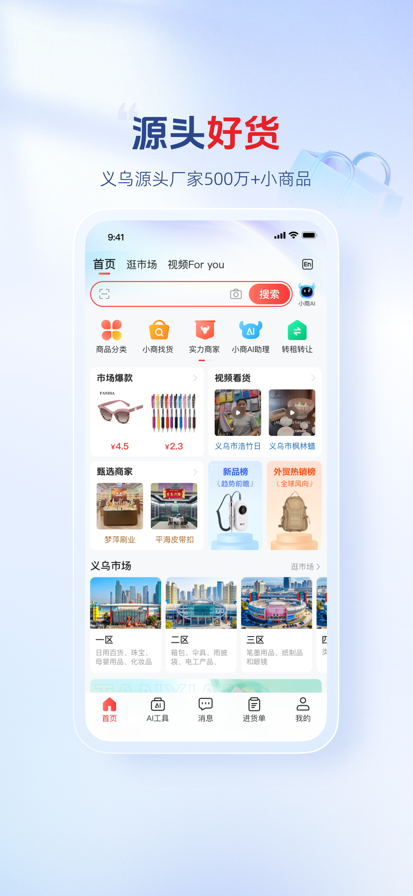 小商品城是一个批发采购与零售购物的电商平台,源头好货厂家直购先行者,享誉全球的义乌国际商贸市场(义乌小商品城)唯一官方指定APP。采购进货,与工厂面对面,抢占一手低价货源;全民批发,享高性价比购物,体验一件也是批发价的生活。打开小商品城APP,开启批发购物新模式。 【国企背景】 义乌小商品城平台隶属于商城集团(600415.SH) ,已入驻8万余家实体商铺,上线300多万种商品,与产业链上游200万家中小微企业紧密相连。 【为什么选择义乌小商品城】 1、全面!小商品市场店铺全覆盖,丰富商品选择! 2、真实!线上线下商铺一一对应,线上逛商铺享线下体验! 3、便宜!跳过渠道中间商,以工厂价拿一手货源! 4、方便!3D地图全景导航,找货更轻松! 5、闭环!打通贸易全链路,省时省力又省心! 6、直播!独有专业市场直播,网红选品推荐! 7、信赖!商城集团出品,交易保障购物无忧! 【找货神器】 识图找货:拍照或上传图片直接找到同款或相似商品。 市场地图:打开地图导航带你逛市场快速找到批发货源。 搜索匹配:输入任意关键词精准匹配商户店铺商品。 一对一服务:24小时内专人响应。 【货源基地】 大量亚马逊、全球速卖通、阿里巴巴1688、阿里零售通、淘宝、天猫商城、拼多多、京东商城、京东掌柜宝、苏宁易购、考拉海购、洋码头、闲鱼、采源宝、慧聪、敦煌网、中国制造网、义乌购、千牛、旺旺、微店微商、线下致富创业开店、地摊夜市、网红直播带货等相关电商卖家进货源头,货源批发集结地! 工艺饰品、节庆用品、童装母婴、玩具童车、美容化妆、个护家清、日用百货、厨卫用品、办公文教、钟表眼镜、服装内衣、鞋靴袜饰、体育娱乐、汽摩用品、针仿织品、宠物园艺、皮革箱包、辅料包装、数码家电、建材家装、机械五金、电工电子、食品生鲜、进口商品等全行业覆盖。 【义乌指数热门货源批发】 *工艺饰品批发 *日用百货批发 *男装女装童装内衣批发 *鞋靴袜饰批发 *机械五金批发 *母婴用品批发 *手机配件批发 *玩具童车批发 *进口商品批发 *汽摩用品批发 *地摊物品批发 *节日礼品批发 *厨卫用品批发 【联系我们】 官方网站:www.chinagoods.com 服务热线:96032
