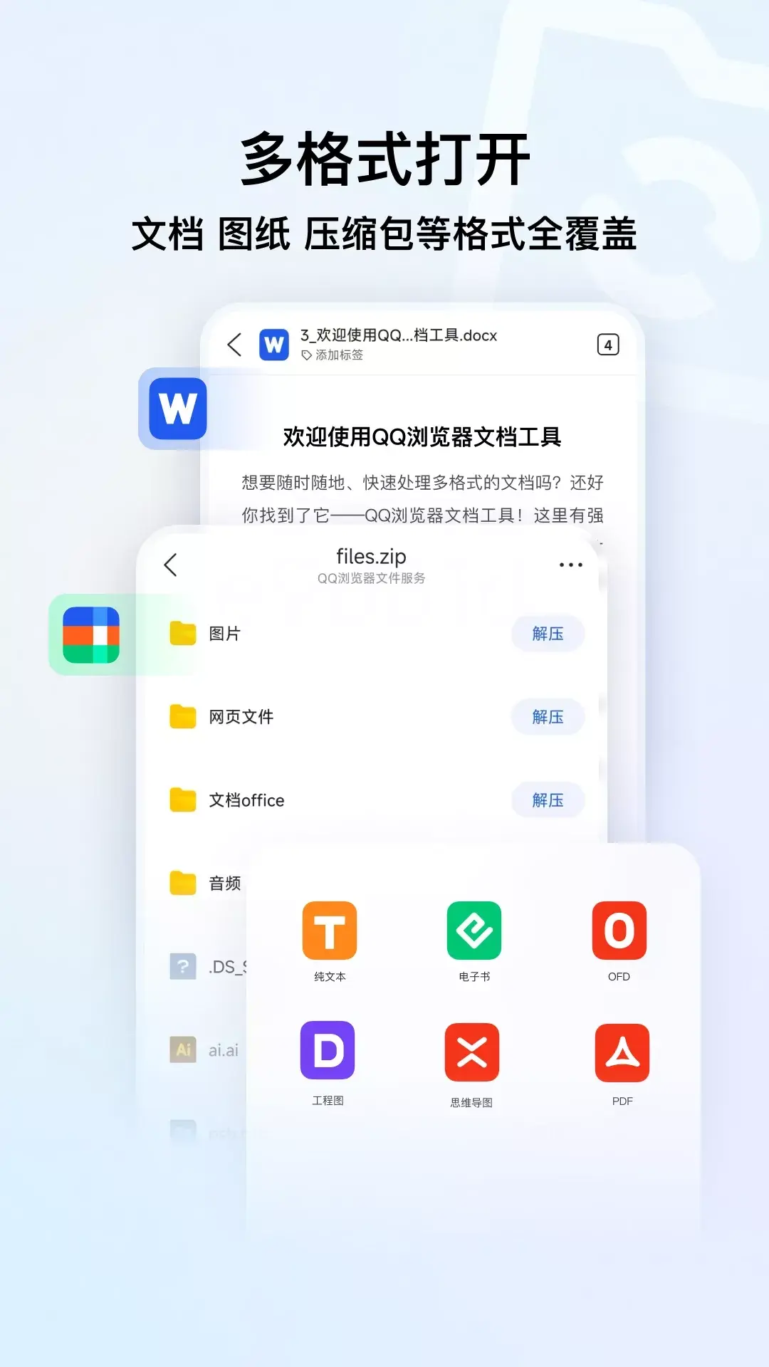 QQ浏览器,您的全能文件管家!完美支持PDF、Office、WPS等常规文档,更独家兼容设计图纸、3D模型等90%+特殊格式。高清渲染保持原版排版,并提供PDF标注、Office编辑等强大办公功能,让移动办公更高效便捷。 【AI公考通】 AI帮你智能筛选优势岗位,同时结合自身情况个性化定制,还能实时推送有编制机会,助你精准报考,高校上岸。 【AI学习助手】 拍照答疑秒回应,考点智能拆解,错题自动归集,更有相似题助你举一反三,薄弱点越练越少!定制学习路径告别拖延——AI学习助手,你的全能学习搭子 【AI搜索】精准直达 轻松秒懂 ●更快:最优解即搜即得,直接给你想要 ●更稳:长问题用深度思考,回答全面可靠 ●更懂:拍照搜、语音搜,AI看懂听懂帮你秒懂 【热点资讯】优质内容 及时丰富 ●更清晰:智能推荐你关心的时事、财经、科技、娱乐资讯 ●更全面:实时看全网热搜榜单,重大事件追踪报道+多角度梳理 【效率办公】办公工具 轻松提效 ● 更全面:支持90%+文件格式打开,完美支持打开PDF、Office、WPS等常见格式,更支持包括设计图纸、3D模型、思维导图、M3U8、压缩包,安装包等特殊格式,满足专业需求 ● 更省事:PDF与Office文档全能处理,支持格式转换、文档翻译、文件瘦身、智能扫描等多款实用工具,同时集成工具权益卡,让办公高效又经济 ● 更省力:内置专业文件管理器,支持Office、PDF等格式一站式编辑转换、增删改查 【AI学习】搜题练题 轻松答疑 ●更全面:无论自学还是辅导,拍照答疑、多语翻译QBot都有招 ●更易懂:AI一对一讲解知识点,步骤解析,举一反三,学习丝滑不卡壳 【来自用户的心声】 工欲善其事必先利其器,我用的工具 QQ 浏览器,一直离不开的原因简单粗暴:工作学习两手抓,能把老板和老师给的任务同时搞定的实用工具。—胡萝卜拉丝儿 还比较方便,换了好几部手机也一直在用QQ浏览器。—兴哥无与伦比 一直使用的唯一浏览器,功能强大,非常好。—月晓风轻 反馈方式: -软件反馈:我的→设置→帮助与反馈 -官方QQ群:716365189 -官方网站:https://browser.qq.com/