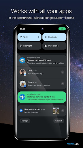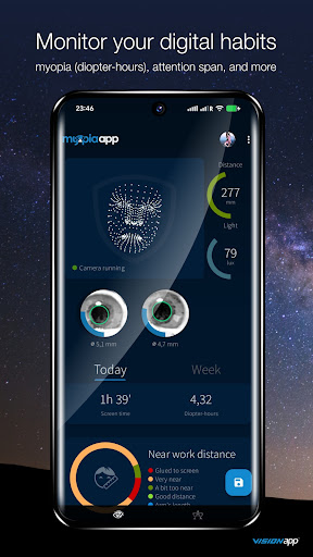 每次你看屏幕📱,你的眼睛👀都在工作。但工作强度有多大?持续时间有多长?对你的视力又会造成多大的影响?<br><br>Myopia.app 以其他任何应用都无法比拟的方式,持续⏱️、私密🔒、实时⚡地测量你日常生活中的数字习惯:<br><br>📏 面部与设备距离——你一天中与设备保持的距离,而不仅仅是你注意到它的时刻<br><br>🔬 屈光度小时数——你眼睛的累计近距离工作负荷,这是视觉科学家认为与近视发展相关的指标。终于可以测量了。终于可以拥有它了。<br><br>🌤️ 环境光线——无论你的环境是在保护眼睛还是在刺激眼睛,从昏暗的室内环境到明亮的自然光<br><br>📊 屏幕使用时间——不仅统计总时长,还会按使用时长、时间段和视觉强度进行细分<br><br>😴 注意力持续时间和睁眼程度——追踪你一天中视觉疲劳和专注度的细微信号<br><br>了解是第一步🧠✨。不了解你目前的视觉习惯,就无法养成更健康的视觉习惯。<br><br>Myopia.app 让你清晰、持续地在你的设备上了解你的视觉状况📱🔐。<br><br>你的视力👁️。你的数据🔒。你的选择💫。