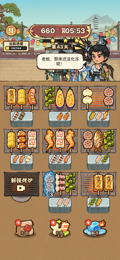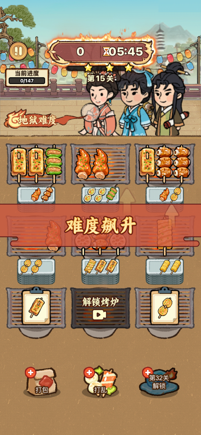 烤串下肚,如有神助~ 《烤串大消除》是一款以古代街头烧烤为灵感的消除加经营类游戏。玩家将化身为穿越古代的烧烤大拿,凭借现代人对烤串的了解,决定在客栈中研发并售卖古人从未尝试过的烤串。烤盘上凌乱交错着各式美味烤串,玩家需找到3串相同的烤串触发匹配消除;最后完全消除对应关卡给到的所有烤串,则完成通关。 *碰撞烤串灵感,烤制人间至味 为顾客研发供应他们没有尝试过的现代烤串搭配,多款神秘烤串带你解锁~ *建设属于你的烟火小客栈 随着烤串生意的逐渐火爆,玩家不断解锁新的烤串品种,升级客栈设施,吸引更多不同身份的古代客人,逐步将破败客栈经营成闻名四方的豪华客栈。 *特殊访客&限时订单 每次升级客栈,都能提升客栈的整体档次和知名度,吸引更多不同身份的客人,如文人墨客、江湖侠客、达官贵人等。不同身份的客人对烤串的口味和客栈的环境有不同的需求和评价,满足他们的限时订单可以获得更多奖励。 是时候开启你的古代烧烤传奇,成为那个时代的美食潮流引领者。 轻松一点,上瘾又解压~
