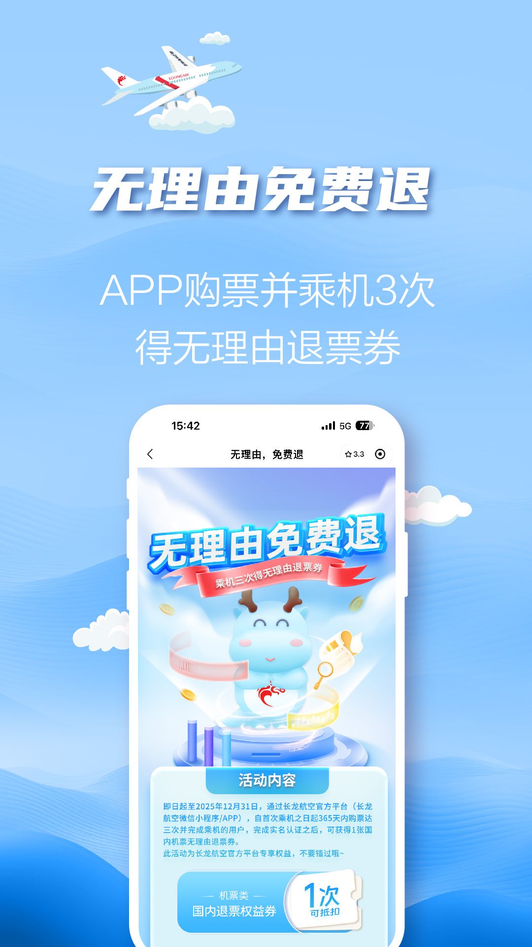 【浙江长龙航空】<br>浙江长龙航空股份有限公司(ZHEJIANG LOONG AIRLINES CO. LTD.)成立于2011年4月19日,2012年8月9日货运首航,2013年12月29日客运首航,是以杭州萧山国际机场为主运营基地的浙江省唯一的本土总部型客货综合公共运输航空公司,拥有国内国际、客运货运全牌照航空运输资质,属中大型航空公司,居民营航空公司前列,是浙江省重点培育的“雄鹰企业”。<br>【各类机票优惠活动】<br>每月6日会员日、特价机票、优惠活动、会员福利等不容错过。<br>【特色功能】<br>机票的预定、退改、特色升舱、选座、航班动态、在线客服、机票验真、报销服务、补订儿童机票、预付费行李等自助服务。<br>更多信息请关注<br>微信公众号:浙江长龙航空<br>官方微博账号:@浙江长龙航空<br>小红书:浙江长龙航空<br>客服热线电话:956199