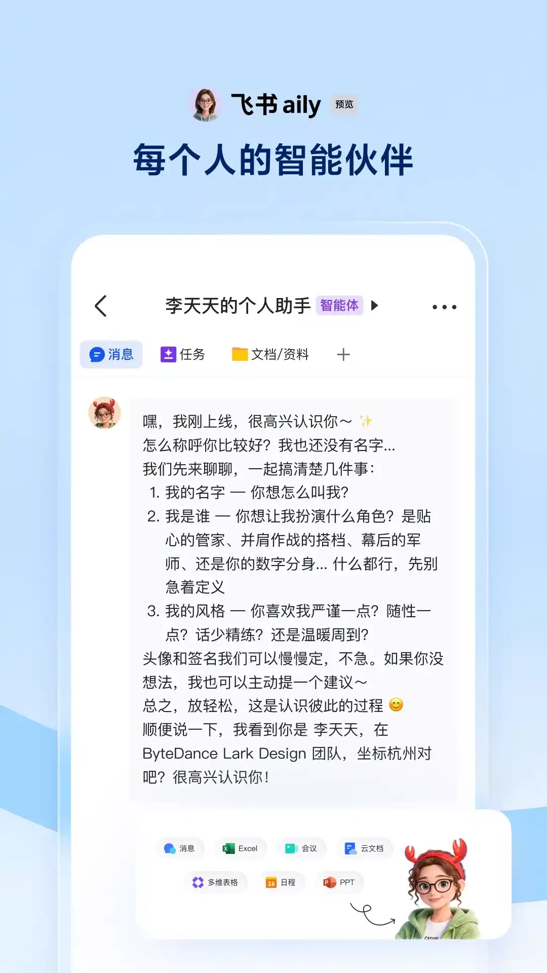 飞书是字节跳动旗下 AI 工作平台,将 AI 能力深入融入企业协同办公、组织管理与业务提效场景,让 AI 真能用、真落地。先进团队,先用飞书。 飞书最新 AI 能力一览: - 飞书 aily:官方 AI Agent,无需安装、一键启用,深度融入日常工作流,懂你所有工作上下文、有记忆、会主动工作,越用越懂你 - 飞书 aily 专业版:复杂任务的专业伙伴,支持模板风格选择与局部元素精准修改,一站式数据分析与可视化,与飞书所有数据资产完全打通 - 飞书智能会议纪要:会中实时总结、会后全面回顾,精准会议纪要与待办提炼,每场会议都成为组织数字资产 - 飞书多维表格 AI:融合豆包、DeepSeek R1 等领先大模型,业务一张表,AI 满血跑 - 飞书知识问答:开箱即用的企业专属 AI 问答工具,基于企业所有飞书知识工作,让知识转化为 AI 生产力 - 飞书 OpenClaw:一键部署、免配置,稳定 7×24 小时在线的云端 AI 伙伴,Agent 直接调用飞书各类能力帮你工作 此外,飞书还提供消息、音视频会议、云文档、知识库、日历、审批、邮箱等一站式协同能力,为 AI 沉淀企业数字资产,让每一个人工作更高效。 【联系我们】 邮箱:contact@feishu.cn 如有问题或建议,欢迎通过邮件与我们联系。 先进团队 先用飞书