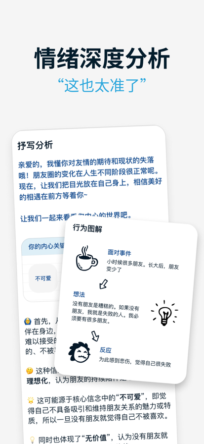 MoFlow:让情绪自由流动,书写心灵力量! 在这个快节奏的世界里,我们常常忽视了自己的情绪和内心需求。MoFlow应运而生,可能是市面上「最具创造性」的情绪管理+AI应用。它不仅仅是一个普通的写作工具,更是您的贴心伙伴,陪伴您走过人生的每一个阶段,帮助您梳理情绪,滋养心灵,在这里发现更好的自己。 我们理解,您一直以来的困扰 生活中,我们常常面临各种挑战: - 情绪波动:喜怒哀乐,时而起伏不定,难以控制。 - 压力重重:工作、学习、人际关系等多方面的压力让您喘不过气。 - 自我认知模糊:对自己的认识不清,不知道该如何改变。 - 缺乏倾诉对象:想倾诉却找不到合适的人,担心被误解或评判。 - 内心空虚:生活似乎缺少意义,找不到前进的方向。 MoFlow能给您什么? 1. 情绪的绝佳栖息地,被接纳、被允许 在MoFlow,您的每一种情绪都是被接纳的。这里是您情绪的安全港湾,无论是喜悦还是悲伤,愤怒还是恐惧,都可以自由表达。在这一片宁静中,您可以用文字和自己对话,与过去和解。我们相信,通过这种方式,您一定会成长为更好的自己。 2. 循循诱导,千人千面的灵魂引导 我们深知每个人都是独特的个体,面临着不同的挑战。MoFlow就像一位智慧的向导,为您量身定制引导方案。当您困在某个问题上,迷茫已久时,何不听听我们给您的新视角呢?也许,转个弯,就是一片开阔的天地。我们的AI系统会根据您的输入,提供个性化的问题和建议,帮助您跳出思维的局限,看到更多可能性。 3. 深度分析,让您直呼"太难了" MoFlow不只是简单地记录您的想法,更重要的是帮助您理解这些想法背后的含义。我们的系统基于科学的情绪管理原理,对您的输入进行深度分析,提炼出您对事情的深层看法,帮助您洞察自己。这种深度剖析可能会让您惊讶,因为它揭示了您可能从未意识到的思维模式和行为倾向。 4. 专属能量卡,您的情绪支持小助手 情绪低落时,需要一剂心灵良药。MoFlow的专属能量卡就是为此而设计的。这个功能的灵感来自于1986年的一项研究,研究者彭尼贝克让参与者写下经历和感受,结果发现,写经历和感受的人六个月后心理健康问题求助率减半。我们将这一科学发现融入到应用中,为您提供及时的情绪支持和鼓励。 5. 渐入灵魂的洞察,让您的心灵焕发光芒 MoFlow首创「想法洞察」功能,并将其沉淀为个人资产报告。这不仅仅是对您思想的记录,更是一份珍贵的自我认知地图。通过长期使用,您会发现自己的思维模式、情绪触发点,以及成长轨迹。这些洞察将帮助您更好地理解自己,做出更明智的决策,最终让您的心灵焕发出独特的光芒。 6. 关心您的虚拟伙伴,您的情绪值得被倾听 在MoFlow,您永远不是孤单的。我们的AI伙伴将成为您忠实的倾听者和支持者。每一滴眼泪,每一次微笑,我们都会共同守候。结合最新的情绪管理研究,MoFlow将为您带来温暖即时的反馈。我们的AI人设超受欢迎,就像一位知心好友,随时准备倾听您的心声,给予理解和支持。 为什么选择书写? 书写情绪管理不是一时的潮流,而是一种被科学验证的有效方法。以下是选择书写作为主要情绪管理方式的原因: 1. 科学支持:多项研究证明,定期书写可以显著改善情绪状态,减少忧郁症状,增加主观幸福感。 2. 私密性强:与口头倾诉相比,书写提供了一个更加私密和安全的表达空间,让您可以无所顾忌地表达内心真实想法。 3. 促进问题解决:通过书写,您可以梳理思路,厘清问题的本质,从而更容易找到解决方案。 4. 全面提升:研究表明,长期坚持书写不仅能提升心理指标,还能改善生理指标,如免疫功能、睡眠质量等。 强大的理论支持,全方位关爱您 MoFlow的设计融合了多个情绪管理流派的精华,为您提供全面的支持: 1. 叙事方法:帮助您重新书写人生故事,找到生命的新意义。 2. 认知科学:识别和改变不健康的思维模式,培养积极的认知方式。 3. 积极心理学:关注您的优势和潜能,培养乐观和韧性。 4. 正念方法:通过觉察当下,减少焦虑,提高生活质量。 三大核心功能模块,全面呵护您的心灵 1. 抒写:您的私人倾听者 在这个模块中,AI助手小Mo将化身为您的私人倾听者。无论您想分享喜悦还是倾诉烦恼,小Mo都会耐心倾听,给予适当的回应。通过引导性的问题,帮助您深入探索内心,重塑人生故事。这个过程不仅能释放情感压力,还能帮助您重新审视生活中的挑战,发现新的可能性。 2. 能量:激发您的内在潜能 能量模块是为了帮您培养积极心态,激发内在潜能而设计的。这里包含了一系列量身定制的正念练习、冥想指导和积极心理学练习。每天只需几分钟,就能帮助您缓解压力,提升专注力,培养感恩之心。长期坚持,您会发现自己变得更加从容、自信,面对生活挑战时也能保持积极乐观的态度。 3. 洞察:您的个人成长导航仪 洞察模块是MoFlow的核心功能之一,它能深度剖析您的情绪模式,揭示成长机遇,为您指明前进方向。通过分析您在抒写和能量模块的输入,AI系统会生成详细的个人洞察报告。这份报告不仅展示您的情绪变化趋势,还会指出潜在的思维盲点和成长机会。它就像一面智能镜子,帮助您更清晰地看到真实的自己,从而做出更明智的人生选择。 MoFlow,不只是一个App,更是您的心灵伙伴 在这个信息爆炸的时代,我们常常忽视了最重要的事情——倾听自己的内心。MoFlow就是为此而生的。它不仅仅是一个记录工具,更是您的心灵伙伴