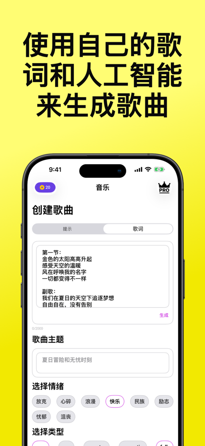 MeloSuno - AI音乐创作与发现:用文字开启音乐世界 MeloSuno是一款智能音乐应用程序,将人工智能驱动的音乐创作与便捷的音乐探索完美结合。无论你是音乐爱好者还是创作者,MeloSuno都能为你提供独特的音乐体验,帮助你轻松开启自己的音乐旅程。 主要特点: AI音乐生成器:用文字创作你的音乐 - 通过输入描述性关键词快速生成独特的音乐,无需等待灵感。 - 支持多种音乐风格,从流行到古典,满足你的创作需求。 - 创作流程简单流畅,让你的音乐灵感瞬间化为现实。 - 简洁直观的界面设计,让音乐探索更加高效,每一段旋律都令人耳目一新。 主要功能: 两种创作模式,满足不同需求 1. 描述模式 通过简单的文字描述生成音乐,快速体验创作乐趣。 2. 定制模式 通过调整更多参数,生成更加细腻且个性化的音乐作品。 支持 V4、V4.5、V4.5+版本 AirPlay音频播放 在音乐生成详情页支持AirPlay播放,轻松将你的音乐分享至更多设备,与朋友共享美妙旋律。 为什么选择MeloSuno? MeloSuno将音乐探索与人工智能创作相结合,既是发现世界声音的窗口,也是表达个人创意的舞台。无论是聆听还是创作,MeloSuno都致力于为每位用户提供丰富且愉悦的音乐体验。 订阅信息: 你的订阅将通过 iTunes 账户自动续订。在当前订阅期结束前 24 小时内,根据你的套餐扣除续订费用。你可以随时在账户设置中管理或取消自动续订,但必须在当前订阅期结束前至少 24 小时取消。如果试用期尚未结束,订阅后剩余的试用天数将自动失效。订阅即表示你同意以下条款: 隐私政策:https://sites.google.com/view/melosunoprivacy 使用协议: https://www.apple.com/legal/internet-services/itunes/dev/stdeula MeloSuno,让音乐创作与发现触手可及!