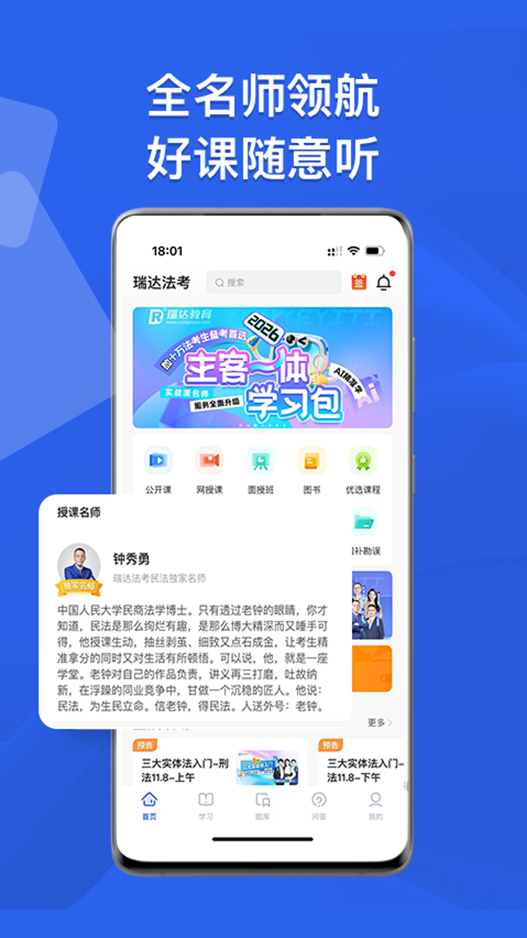 【瑞达法考梦之队】 <br>刑法-刘凤科、三国-杨帆(女)、民法-钟秀勇、行政-徐金桂、刑诉-杨雄、商经-李晗、理论-宋光明、民诉-韩心怡。 <br> <br>【在线学习更轻松】 <br>1.名师授课,全新公开课随意听 <br>刑法、民法、刑诉、民诉、行政、三国、商经、理论 <br>各个阶段课程名师带你学 <br> <br>2.网络直播课,法考学习更灵活 <br>专业讲师带领学习,轻松掌握法考知识重难点 <br>导学师全程陪伴,一对一贴心服务 <br> <br>3.答题训练,主观题在线AI阅卷 <br>新考点、新试题及时更新 <br>客观主观真金题库随意刷 <br> <br>4.快捷提问,答疑更便捷 <br>专业法考讲师解答,快速扫除盲点! <br>热门问答、精选问答,你关心的答疑一览无余 <br> <br>5.课程支持离线下载 <br>课程下载到手机里 <br>随时随地听课,不让蜂窝网络流量限制你的学习 <br> <br>6.学习报告,了解学习情况,掌控学习时间 <br>听课时间、听课天数、听课排名 <br>让数据帮助你分析学习成果,不甘为人后 <br> <br>【联系我们】 <br>新浪微博:@瑞达法考教育@瑞达法考 <br>官方微信:瑞达法考 <br>客服热线:400-1660-360,400-1880-360