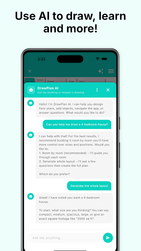 DrawPlan 让你通过触控或 AI 轻松创建专业平面图。无论是快速草图还是精准的比例绘图,都无需任何制图经验。<br><br>按你的方式绘制<br>• 用手指自由绘制<br>• 或创建带自动尺寸的精准比例图<br><br>AI 辅助绘图<br>• 描述你想绘制的内容<br>• AI 协助规划与布局<br><br>对象与细节<br>• 添加门、窗、家具、标签和尺寸<br>• 创建并保存自定义对象<br><br>适用于真实工作<br>• 适合专业人士、设计和房地产<br>• 清晰且易于沟通的平面图<br><br>无限项目<br>• 创建不限数量的平面图<br>• 通过云同步在所有设备上访问