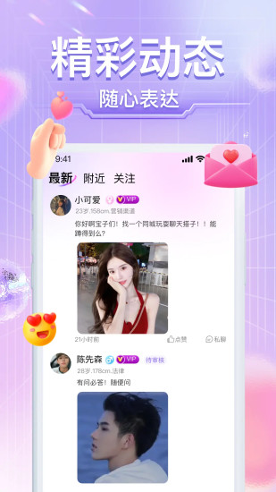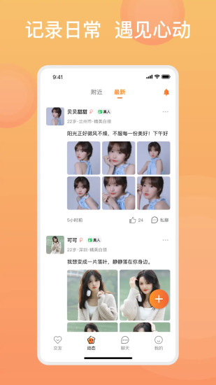 探颜,通过互动、邀请来解决同城用户社交冷漠化的现状,更是以有趣的文字、有料的图片视频等形式,给无数用户创造脱单机会,帮助您 快速找到附近兴趣相投的有缘朋友! 这里有更多更高颜值用户等你来约,更加真实的交友体验! 在这个高颜值世界里面,你可以快速发现和结交附近你喜欢的陌生人朋友,约上志同道合的小伙伴,一起聊天交友,约会,商务差旅!不再默默一个人。 特点: 心动推荐:优先推荐附近高品质,真颜用户交友,喜欢就开聊; 真实用户:通过真人认证,人工审核,拒绝一切照骗和不真诚的行为; 专属陪伴:寻找属于您的有趣灵魂和伴侣; 隐私保护:可以设置账号的保护机制,让你根据使用情况随意和完美展示和隐藏自我。