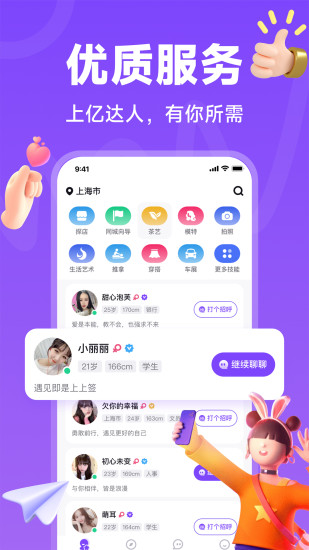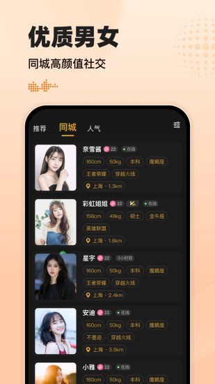 同城交友同城约会附近陌生人,附近交友陌生人陌聊天,同城陌约见,邂逅附近身边陌生人,专属你的同城交友附近约会交友聊天软件。 集合附近单身异性在线畅聊交友,3秒搭讪一分钟进入甜蜜互动聊天模式全新附近约聊约见面功能,更有附近单身异性24小时在线互动嗨聊,陌生发现身边有缘人,有料有颜值,来场不一样的同城交友同城约会聊天交友新体验。 同城交友同城约会,为陌生单身男女定位附近800米有缘人,探一探直接拨通,面对面亲密聊,打造附近零距离陌生人聊天交友爱聊恋爱平台,让附近人脱单交友约会不再是难题!在这里你可以随时随地与附近高颜值陌生的TA面对面探讨探聊天交友约会。 在陌声约陌生附近人,视频资料真实认证,一分钟拉进彼此的距离,开始与附近人的浪漫邂逅;陌声陌生附近聊天互动缘分发现身边的陌生单身异性,从语音聊天开始,再到陌陌语音互动,轻松邂逅附近属于你的缘分。在线探讨探聊天拉近彼此的距离,减少陌声距离感。我们有千万实名在线用户,探一探发现心仪伴侣,让你迅速携手同城附近异性,快聊成功脱单。 陌约陌聊同城交友约会聊天,一款专为附近陌生单身男女打造附近陌陌在线聊天交友约会的社交平台。