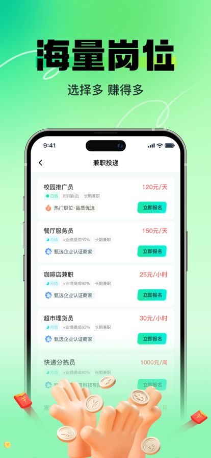 本平台不提供未成年人兼职工作岗位 全民帮兼职是一款专注于互联网自由副业兼职APP。坚持与用户一起打造一个真实可靠的自由兼职副业赚钱工作平台,让更多想开辟第二职业的人,依靠自己的才艺技能,实现工作自由,兼职副业赚钱,多一份收入,多一份自由。 兼职副业赚钱从全民帮兼职开始。 不管您是准备成为自由职业工作者,还是已经是自由职业工作者,全民帮兼职平台都能满足您的工作需求。 互联网、自媒体、物流、电商、旅游等各行各业的人才需求这里都有,不管您擅长销售、服务,还是Python、JAVA、视频剪辑、ps设计、插画等专业技能,哪怕是吹牛厉害(配音兼职就很合适)都能在全民帮兼职平台找到自己擅长的自由工作,实现才艺技能变现,增长自己的收入。 【精品兼职推荐】 每天从海量的兼职岗位中给你推荐高薪资、高颜值、高格调的精品兼职,不但能通过兼职工作积攒工作经验,更能拓展视野,增长见识。 【高效沟通】 只要你看上的兼职岗位,直接开聊,谈薪资,谈要求,聊结算,达成共识,当场拍板敲定,直接开工赚钱。 【真实可靠】 不管是企业还是个人商家,发布工作、项目需求,必须经过至少5层验证:实名认证、资质认证、第三方公信认证、人工复查、根据实际情况现场审查,不定期抽查等,保障每一个商家都是真实可靠有保障的。并且,定期会对用户进行回访,一方面为了确保工作的真实性,保障你的基本权益;更重要的是进步确认商家的真是可靠性,逐步筛选出优质商家,为你自由工作保驾护航。 【自我提升】 帮助用户提升竞争力,塑造良好的自由工作者形象,是我们的首要任务,也是我们重点帮扶政策之一。我们联合了众多培训机构、学校,开发出各类精品课程。有免费公益课程,也有收费的深度提升课程,如配音学习、ps设计教程、视频剪辑、后期编辑、编剧学习、Python、JAVA等。只要有恒心,必将成为一个各大商家都争抢的专业人才。
