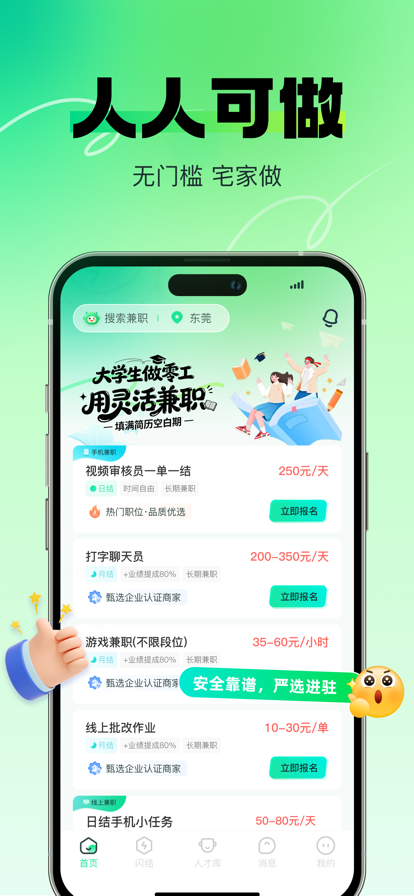 日结赚钱找工作兼职,灵活接单兼职平台。本平台提供低门槛的短期工作机会,致力于让“零散努力”都能获得即时回报,非常适合寻求时间自由、想利用空闲时间赚取收入的人群! 产品内设闪结小站,薪资提现快有保障,闲时来闪结小站接单,手机赚钱多多。 无论是在等地铁公交,还是在排队打饭,还是在等孩子放学,顺手来接一单,积少成多,轻松实现奶茶蛋糕自由! 之前没做过,不知道能否上手? 别担心,本平台岗位新手友好:不卡简历,部分岗位包教包会~ 赚米兼职适合谁用? 学生群体:课外时间做零工赚零花钱找实习,手机就能赚钱,减轻家庭负担; 上班族:打工人发展副业接单赚钱,增加第二份收入; 宝妈宝爸:宅家兼职赚钱,带娃赚钱两不误重拾经济独立: 自由职业者:接私单变现技能,收入多多。 产品主推: 在线兼职:批改作业,视频审核员,游戏兼职、短剧转发员、绘画涂色、视频转发,打字回复客服,带货赚佣、文案编辑、手机任务,语音主播,PPT接单、剪辑、聊天客服等岗位,一单一结 本地工作:服务员(奶茶店、肯德基、麦当劳、必胜客、瑞幸、库迪)、地铁安检员、快递外卖配送员、工厂普工、app运营助理、java技术、店铺售货员,桌球厅助理、图书馆图书整理员、电影院检票员,大量招聘小时工,日结薪资更安心 安全保障: 企业资质人工审核:薪资由平台托管:7x12小时专属客服 平台承诺全程介入处理兼职纠纷,通过「事前审核-事中监督-事后追溯」三重机制,全方位维护用户合法权益。 用户服务通道:若您遇到以下情况,请立即联系我们: 1.兼职所遇各种问题, 2.异常岗位信息不符 3.用工方违规行为 4.其他权益受损问题 官方邮箱:chentaotao@taotaotec.com 处理时效:工作日1小时内响应,复杂问题48小时内出具解决方案。