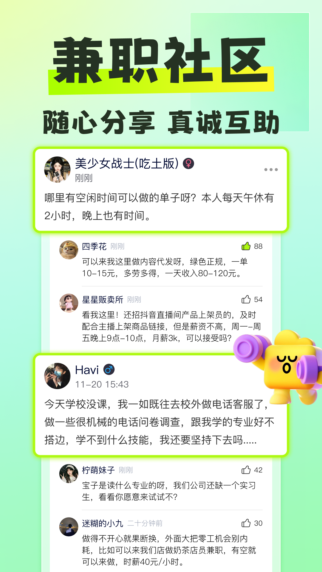 须知:根据相关法律要求,本平台不为18岁以下未成年人提供就业服务。<br>【适应人群】 18-40岁人群 涵盖上班族、宝妈宝爸、白领、待业者、在校大学生等有一些空余时间的人群。<br>【海量职位】<br>近百种线上线下兼职岗位,平台认证审核。让您每次都有不同的兼职体验。无论是补贴零花还是技能提升都会对您充满帮助。<br>【平台保障】我们是国内率先推出薪资“预支付托管”模式的平台,所有发布招聘的企业都有招聘保证金放在平台。纠纷时优先保证金赔付,保障劳动者的薪资权益。所有岗位信息5重审核,确保岗位真实、优质,有效。2024年9月,平台联合支付宝蚂蚁保推出“灵活用工意外险(电信防诈版)”为求职者提供最高赔付12万元的求职保障。<br>【岗位服务】主推薪资日结岗位,保证薪资发放及时。覆盖7个大类近百种岗位,主要包括本地附近职位、线上主播类职位、代理销售类职位和技能副业类职位。<br>【客服响应】专业客服团队365*16小时在线处理您在兼职过程中出现的任何问题,24小时内极速处理。帮您解决所有问题。给您优质的就业体验。<br>【技能副业】为满足用户长期副业需求,平台联合头部机构推出唱歌游戏主播、网店就业、Python编程、JAVA编程、配音播音、插画创作、自媒体、等十几种技能副业岗位,人均月薪资达6K。