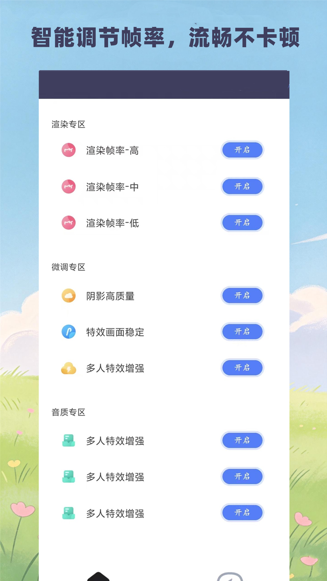 画质大师是一款专注游戏画面优化的工具,提供画质调节、帧率稳定、清晰度增强、画面流畅度优化等功能,适配不同机型,操作简单、无广告。<br>可根据设备自动调节画质与帧率参数,让游戏画面更清晰、运行更流畅。<br>本应用仅提供画面显示优化,不修改游戏数据,安全合规。