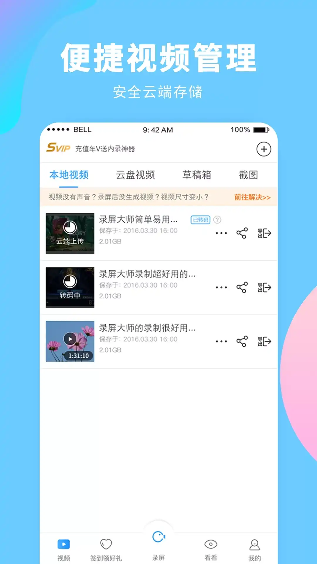 【录屏大师】免费高清录屏工具,灵活录屏、超清画质,让手机录屏变得更简单 录屏大师,完全永久免费高清录屏和流畅稳定的手机录屏神器。录屏大师带来专业的录制屏幕体验和便捷的录制开启姿势,能轻松捕捉手机屏幕上演绎的故事,并且运行占用低,丝毫不影响您使用手机其它应用时的体验。录屏大师还独具创新的视频编码技术,使其录制的视频高清流畅,体积小。同时还附带有视频剪辑的扩展功能,满足您制作美轮美奂的视频需求,既快捷又有趣。 录制完成后: 视频可以:播放、编辑、删除、上传、导出、还可以一键分享给好友。 主要功能 灵活控制录屏的开始和结束 悬浮窗、通知栏、摇一摇多种方式控制录屏开始/结束 完美支持录制声音或者解说 支持同时录制声音,还有主播模式同时录制解说画面 不同录制方向以供自由选择 在录制开始前根据画面选择内容是横屏还是竖屏显示 视频质量,清晰度自由切换 导出时可选择多种清晰度,满足不同用途的需求 剪辑,字幕,配音随意编辑 多段视频、图片无缝集合,海量特色贴图,滤镜与颜文字 一键上传,分享到社交网络 微信、QQ一键分享,更有机会得到官方推荐 使用流程: 准备: 1、启动软件,并允许软件所请求的权限(存储,录屏,录音); 2、务必根据录制内容朝向,点击对应的横屏录制或竖屏录制;(否则会出现画面很小的情况) 录屏: 无浮窗录屏的操作模式下, 1、点击录制后会直接开始录屏; 2、想要暂停/停止录屏,回到录屏大师主页点击暂停/停止即可; 浮窗录屏的操作模式下,(需要按提示给软件悬浮窗权限) 1、点击录屏返回桌面会出现悬浮窗,点击悬浮窗上的录制,开始录制; 2、点击悬浮窗上的暂停按钮,暂停录制, 3、点击悬浮窗上的停止按钮,停止录制并生成视频; 客服QQ:3422173762 用户交流群:912850353