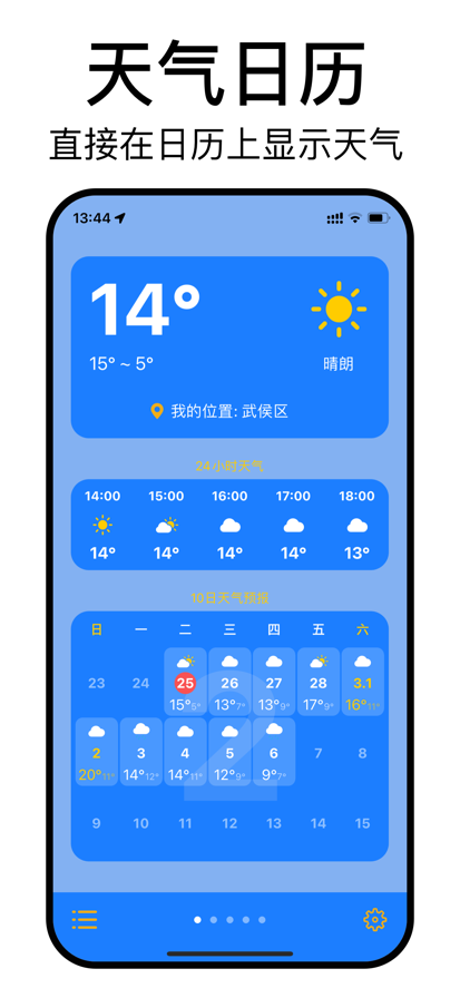 天气和日历从来都是密不可分的,人们在查看未来天气预报时往往都需要关注日期,比如人们喜欢查看未来某一天的天气和对应的日期方便预订机票和酒店;然后在我们大多数的天气App中,却忽视了它们之间的关联性,使得人们不得不在天气和日历两个App之间来回的切换。 所以我们创造了[天气日历]App,在日历上直接显示对应的天气预报,同时支持小组件,可以在手机桌面更快捷的查看日历和天气。