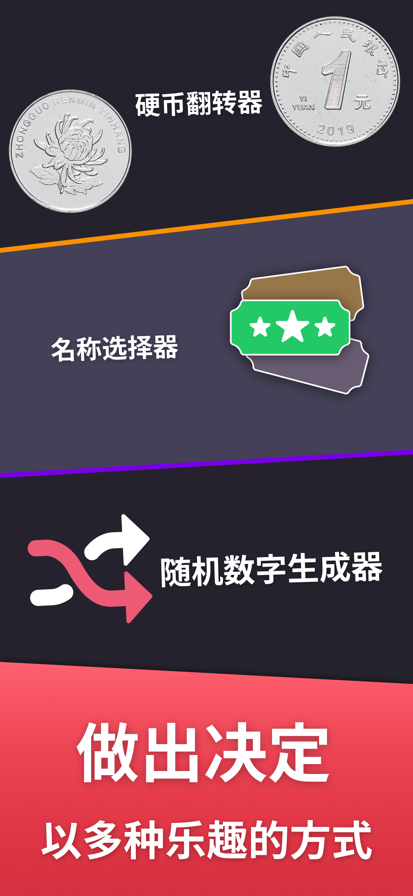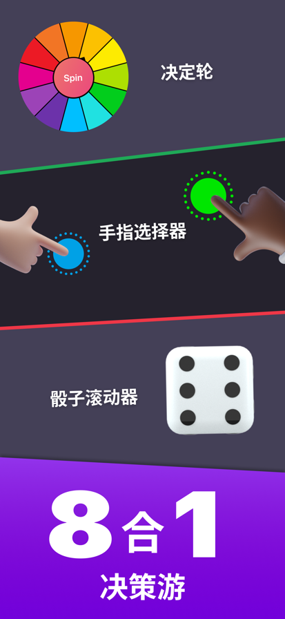 向您介绍Choosify(例如1 Tap Roulette),这是您决策过程中的终极伙伴,让生活中的选择变得有趣、令人兴奋且无压力!您是否厌倦了日常生活中无法从众多选项中做出决策的困扰?再也不用犹豫了;Choosify将用其独特且引人入胜的方式帮助您摆脱困惑和犹豫。 通过Choosify改变您的决策过程,让不确定性变得令人兴奋。无论您是为自己还是与朋友一起做决定,Choosify都能帮到您。那么,还等什么呢?现在就下载Choosify,开始做出既有趣又有效的决定吧! Choosify拥有8款有趣的迷你游戏,让您轻松做出决定: 1. 决策轮 - 旋转多彩的轮盘,让命运决定结果!体验决策轮的激情,一个令人陶醉的迷你游戏,让决策变得愉快!输入名字或选项,旋转轮盘,让它的随机器挑选幸运选择。 2. 手指选择器 - 指向那些手指,看着Choosify选中幸运儿!为即将到来的刺激做好准备,与手指选择器一起畅享一个充满高压的迷你游戏,给决策带来电力!聚集起来,让战斗开始,看着手指选择器惊讶地找到答案。轻轻一点,将决定交给这个电气轰轰的选择器。那么,召集你的朋友们,摆好手指,让手指选择器点燃乐趣,带来意想不到的选择! 3. 名字选择器 - 输入一系列名字,让Choosify为您做选择!沉浸在这个随机生成器带来的兴奋中,它将在一个迷人的名字轮中最终挑选出获胜者。拥抱激情,让命运掌控一切! 4. 骰子滚动器 - 掷动虚拟骰子,看看机会将带你去哪里!释放这个电气迷你游戏带给您的无尽可能性,将经典骰子游戏带到您的手机上。通过选择骰子类型自定义您的体验,并通过同时滚动多达6个骰子来提升刺激感! 5. 硬币翻转器 - 正面还是反面?让Choosify的硬币为您做决定!沉浸在投掷的刺激中,同时您可以选择各种国家的定制硬币。轻触一下,让命运决定结果,享受兴奋! 6. 魔术8球 - 提问,让魔术8球揭示答案!体验独特的游戏方式,它可以在经典模式下给出传统答案,也可以切换到有趣、讽刺等其他模式。解锁神秘刺激的世界,深入探究魔术8球的惊人启示! 7. 随机数生成器 - 选择一个范围,让Choosify为您挑选一个数字!拥抱RNG的激情,生成器将产生无限个数字,为您带来无尽的可能性。根据您的喜好自定义设置,让Choosify的RNG揭示一个令人兴奋的世界! 8. 旋转瓶子 - 用这个数字版为您的聚会游戏增添经典元素!重燃真心话大冒险的激情,或者让它为情侣和其他有趣活动做决定。这款多功能的助手能够增强每次聚会的氛围,创造难忘的回忆和无数欢声笑语。旋转并享受吧!