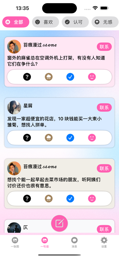 这是一个简单高效的社交聊天交友软件,现在的社交软件大多臃肿繁琐,用户不能精准的获取想要的内容,这款App使用简单 一键发图分享生活、一句话快速社交、精准归类喜欢或者不喜欢的动态 高效 简单 精准的社交软件