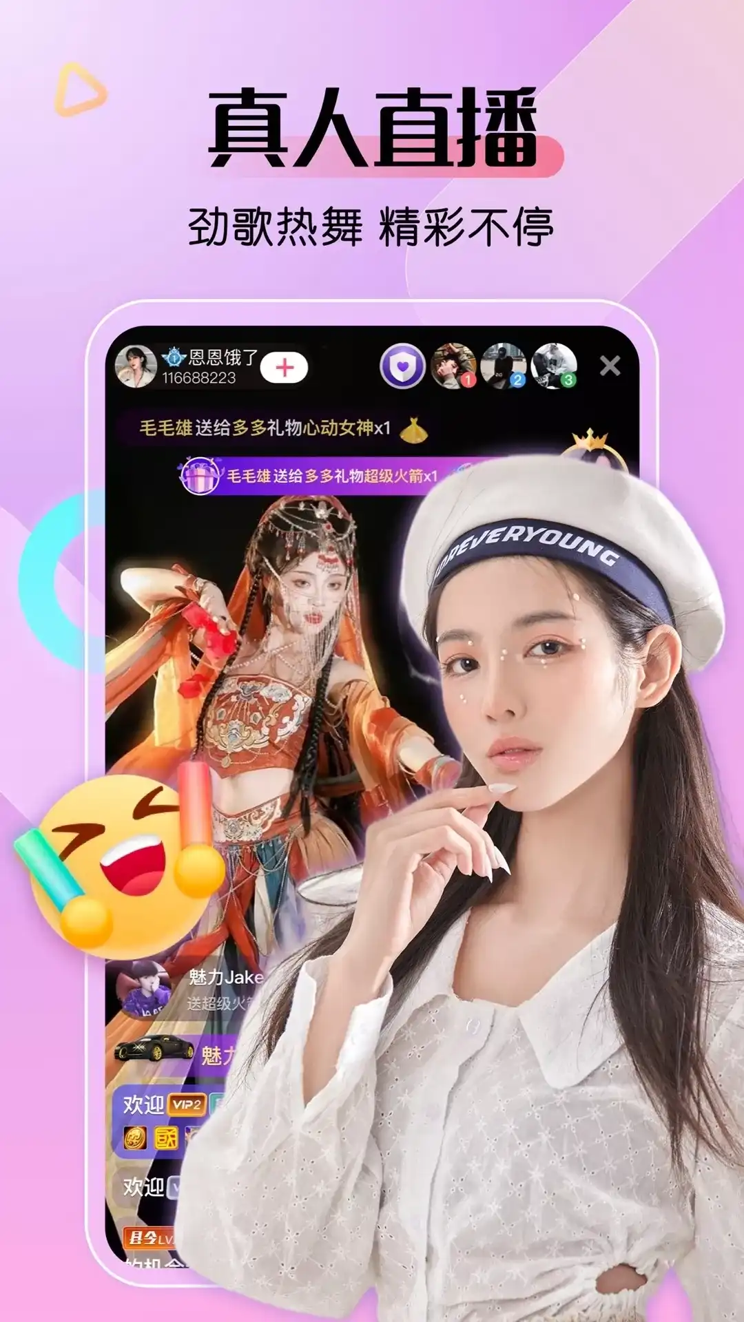 六间房直播-看美女视频唱歌热舞:一款懂你的直播APP,高颜值主播+同城直播。高颜值主播想看就看!才艺达人狂欢直播,新鲜的互动游戏陪你一起嗨不停!搞笑脱口秀精彩直播不间断!又新又潮的直播视频玩法,送你一场不期而遇,随时随地聊天,遇见让你心动的TA! 【颜值主播 才艺超绝】 百变主播,从小清新校花到御姐,风格百变令你眼花缭乱,更有超人气实力唱将现场献唱,舞蹈达人秀陪你High玩不停。 【同城主播 连麦互动】 开启同城主播模式,打造零距离互动体验,随时与主播连麦互动,发现身边的Ta! 【全新升级 3D礼物】 全新上线3D礼物,排面十足。炫酷特效让你引爆全场!快来选取你的心动主播,为她加油助力吧! 【玩转直播 激抢豪礼】 直播间排位赛不间断!豪礼活动不停歇,霸气进场特效赞,专属守护倍儿有面儿!