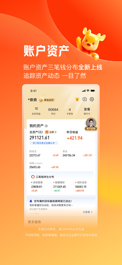 【核心特色】 理财产品多:业内基金多品类覆盖,基金数量超2万只; 基金交易快:便捷开户、交易稳定,理财安全放心; 客户服务好:全年无休,7*24小时客服不间断; 理财费用省:买基金优惠多,申购费率1折起,个别基金除外。 【产品亮点】 1. 活 期 宝:包括多种货币基金,免费充值取现; 2. 稳健理财:汇集低风险和中低风险的中短债基、长期纯债、固收+等产品; 3. 基金优选:汇集中风险以上的股票型基金、指数型偏股基金、混合型偏股基金、QDII等产品; 4. 高端理财:汇集证券公司资产管理计划、基金公司及其子公司专户产品; 5. 智能定投:按期定投,达到目标收益后,若上涨继续持有,若回撤及时止盈; 【功能亮点】 1. 基金交易:业内基金多品类覆盖,理财费用省、交易快、操作便捷; 2. 超级转换:赎回基金后,可直接转入其他公司旗下基金产品,最快T+1日确认,投资不间断; 3. 快速赎回:基金赎回时,T+1日到账活期宝; 4. 自选基金:电脑、手机智能同步,随时随地一键查看自选基金; 5. 财经资讯:每日更新丰富的财经资讯,满足各类投资者的需求; 6. 基 金 吧:人气理财社区,畅聊热门话题。 如果您对选购基金或基金交易有任何问题,欢迎致电官方客服热线:95021。 历史业绩不代表未来表现,基金有风险,投资需谨慎。