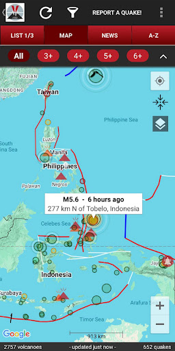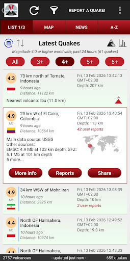 Volcanoes & Earthquakes 是一款强大的实时地震追踪与全球火山监测应用,可查看附近或全球最新地震,浏览活火山,接收即时警报,并跟进有关地震活动、火山喷发和海啸的最新资讯。<br><br>应用收集来自 40 多个国内外监测机构的数据,是目前最全面的数据源之一。您可以按震级、时间、距离、地区、火山状态等条件自由筛选和排序。<br><br>功能:<br><br>地震:<br>• 最近 7 天的全球地震列表<br>• 几乎实时的地震警报<br>• 用户 “我有感” 报告<br>• 活跃火山附近的地震<br>• 自 2012 年以来的地震档案<br>• 按震级、时间、距离、大洲、国家或地区过滤<br>• 按时间或震级排序<br>• 每次地震的详细信息<br>• 统计图表:震级、深度、能量、时间趋势<br>• 如果地震可能被您所在地区感受到,将提示通知<br><br>火山:<br>• 全球 1600 多座活火山和休眠火山地图<br>• 火山状态与喷发历史<br>• 最新火山新闻与火山灰预警<br>• 完整的火山目录<br><br>地图与数据:<br>• 板块边界<br>• 数千条活动断层线<br>• 高压缩数据格式,节省流量<br>• 多种显示与筛选选项<br><br>自定义功能:<br>• 自定义位置警报<br>• 可调节字体大小<br>• 支持 19 种语言<br>• 设置导入与导出<br>• 可选的自动后台更新<br>• 海啸警报及相关新闻<br>• 丰富的界面个性化选项<br><br>即将推出:<br>• 更多数据源<br>• 更全面的地震与火山资讯<br><br>数据来源包括 USGS、EMSC、GFZ、INGV、GeoNet、NRCAN、BGS、IGN、IMO、PHIVOLCS、KOERI、CEIC、CSN、SSN 等。<br><br>免责声明:<br>我们尽力提供准确数据,但无法保证信息的完整性或持续可用性。
