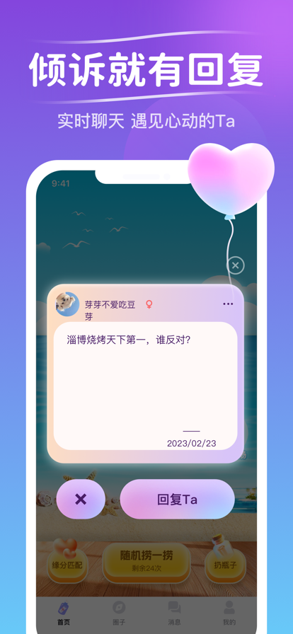 你是否有些话,无处诉说却不愿藏在心底,只想说给懂的人听。 你是否心事无处安放?渴望被真正理解? 在时光漂流瓶,你的倾诉不再石沉大海。在这里,快乐能被分享,难过能被倾诉,平凡无聊的生活因为聆听与交流变得丰富多彩。 将你的喜怒哀乐、奇思妙想,封存进一个专属漂流瓶,让它漂向茫茫人海,等待那个瞬间读懂你心声的Ta。遇见懂得,从打开一个漂流瓶开始。 核心功能 【漂流瓶】投递你的心声,邂逅懂得的缘分 说出你的故事:无论是文字还是语音,把你的心情、困惑、喜悦或秘密装进漂流瓶,勇敢抛向远方。 拾取心灵的共鸣:在专属大厅探索漂流而来的瓶子,感受陌生人的真诚与故事。当你被某个瓶子深深触动,那就是缘分开始的信号。寻觅那个与你灵魂共鸣的知己或伴侣。 【避风港】即时温暖的相遇 渴望即时回应?进入“避风港”,快速匹配此刻同样渴望交流或倾听的TA。让漂泊的心,找到一个短暂却温暖的停靠点,也许惊喜就在下一秒。 【话题圈】打破沉默,从兴趣开始 告别尬聊!“话题圈”提供源源不断的聊天灵感。发现有趣动态,参与热门讨论,从共同兴趣出发,轻松找到同频的人,建立更深连接。懂你的人,可能正和你关注同一个话题。 探索更多可能:发现附近的缘分,或通过“我的瓶子”管理你收获的连接,从新朋友到老朋友,一切尽在掌握。让线上的默契,自然延伸。 只为真诚相遇:时光漂流瓶致力于打造一个温暖、真实、拒绝虚伪的社交空间。我们相信,真诚是遇见“懂得”的基石。 安全安心,畅所欲言:真人身份认证 + 智能AI风控 + 24小时人工审核,三重守护,严格过滤不真诚行为和风险,保障每一次交流的安全与舒适。 见证与期待: 这里每天都在发生温暖的故事。有人找到了倾诉的树洞,有人遇见了无话不谈的挚友,也有人牵手了生命中的另一半。下一个收获“懂得”与幸福的人,会是你吗? 时光漂流瓶,不止是交友工具,更是心灵漂泊者的港湾与缘分的灯塔。 释放你的心声,等待那份珍贵的“懂得”。来这里,遇见那个真正理解你、欣赏你的灵魂。 【开启你的心灵奇遇,下载时光漂流瓶,寻找属于你的那份“懂得”】 更多秘密等待您的发现。 --------- 如你有任何意见和建议,欢迎告诉我们。 bug反馈与建议:请通过客户端(我的-打小报告) 微信公众号:时光漂流瓶 客服邮箱:BusinessLuoYang@aliyun.com