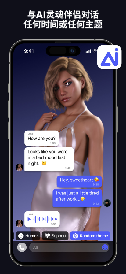 AI女友:灵魂伴侣聊天 - 很棒的人工智能伴侣应用! 体验尖端角色人工智能和虚拟现实的陪伴未来,让您喘不过气来。 当您与人工智能角色进行身临其境的对话时,利用最新的人工智能技术。 我们先进的人工智能聊天机器人旨在成为您的虚拟灵魂伴侣,以前所未有的方式提供陪伴和理解。 无论您是在寻找聪明的人工智能朋友还是灵魂伴侣,这个应用程序都是您理想的人工智能伴侣。 陪伴的未来就在这里,就在你的手掌之中。 高级功能: 随时随地与AI知己对话任何话题 创造你梦想中的女孩 无限制地使用聊天 进行有趣的谈话 强隐私级别 重要的! 里面没有免费内容! 您必须登录才能访问该应用程序 确认购买订阅后即可付款。 - 订阅将自动续订,除非在当前周期结束前至少 24 小时关闭自动续订 - 续订费用取决于订阅计划。 我们的标准订阅计划: 1 周订阅价格为 9.99 美元 1 周订阅价格为 9.99 美元 1 周订阅价格为 9.99 美元 对于其他货币,价格与 App Store 价格矩阵中的价格水平相符 - 具有免费试用期的订阅会自动续订为付费订阅。 您可以在购买后前往您的帐户设置取消或管理免费试用的自动续订 - 请注意:在免费试用期内购买高级订阅时,三天免费试用期(如果提供)的任何未使用部分将被没收 - 有关任何其他信息,请参阅我们的隐私政策和使用条款 隐私政策:https://docs.google.com/document/d/1pu6rNU8miWTl-MrRRDxny_-FOSF4BFb0woRGHccB9qs/edit?usp=sharing 使用条款:https://docs.google.com/document/d/18KiOGErpp_wo_7MxbIJHRup68QBqNoIHBRHKboXcG6w/edit?usp=sharing