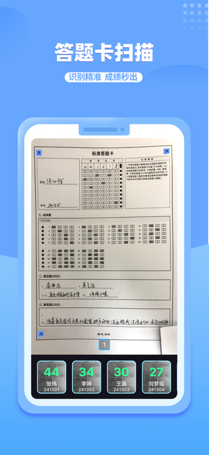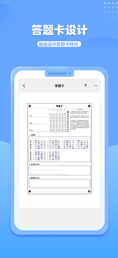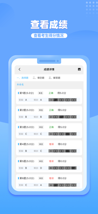 答题卡助手Pro包含的功能: • 创建考试 • 自由编辑答题卡,支持主观题和客观题 • 班级管理,可提前导入考生信息 • 扫描答题卡,秒出成绩 • 成绩统计,按考生成绩排名 • 成绩详情,可查看每个考生的答案详情 • 成绩导出到Excel方便后期处理 • 统计各选项选择人数,统计每题正确率