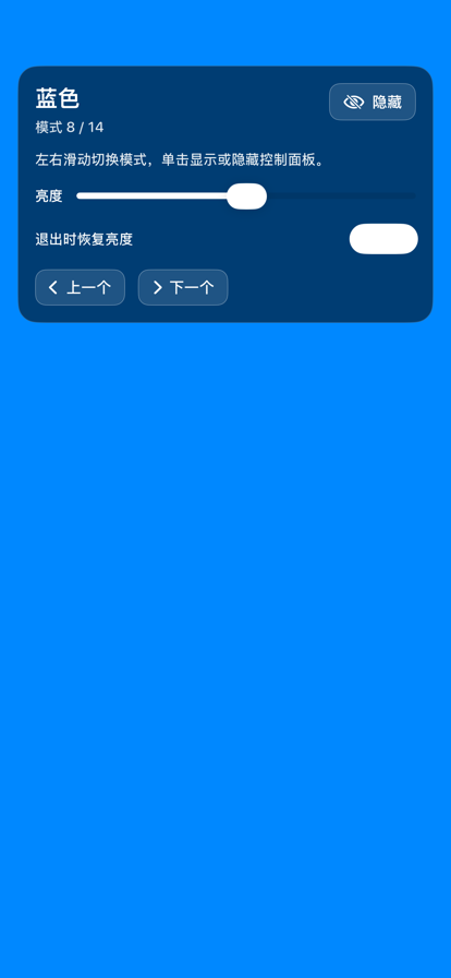 屏幕颜色显示提供多种颜色与测试图案的全屏展示,包含纯色,渐变,棋盘格,条纹与随机颜色模式,左右滑动可切换模式或颜色。支持自定义颜色组并启用自动轮播,可设置切换间隔并对每个颜色启用或关闭。提供亮度调节与退出时恢复亮度选项,使用时保持屏幕常亮,单击可显示或隐藏控制面板,适合屏幕测试与色彩查看。