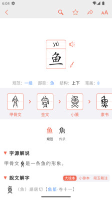 字源是一款探索汉字起源和演变过程的应用,并且内置字典查询功能。目前已收录两万多汉字及其释义;编辑精选了两千多汉字的字源解说及其甲骨文、金文、小篆、秦代隶书等各时期的字形;九千多个小篆字形及《说文解字》(大徐本)、《说文解字系传》(小徐本)、《说文解字注》和《康熙字典》。并提供了百家姓、千字文、小学生1-6年级字表、天文、地理等20个字表,以方便分类查阅。非常适合正在学习汉字的小学生,书法爱好者,以及对中国传统文化和汉字起源感兴趣的人使用。 【汉字起源】 汉字是世界上各大文字体系中唯一传承至今的表意文字,包含着丰富的文化内涵和审美意蕴,是中华民族的智慧结晶,是中华文明的基石。同时汉字也是世界上最难书写的文字,独特的方块字形需要不断记忆,反复练习才能形成书写能力。然而,汉字并非从天而降一出世就是现在这个样子。汉字有着超越五千年的历史演进,一步步走到今天。因此,我们现在几乎不太可能一眼就看出造字的本意了。凭借各种时期的字形图,我们可以一览五千年的人文沧桑。 【甲骨文】 目前发现最早的汉字系统为殷商时期的甲骨文。甲骨文又称契文、甲骨卜辞、或龟甲兽骨文,主要指中国商朝晚期王室用于占卜记事而在龟甲或兽骨上契刻的文字(但是殷商时期的主要书写材料还是毛笔和竹简,商人只是在占卜时才会把文字刻在甲骨上)。自1899年晚晴金石学家王懿荣发现甲骨文,百余年来,考古发掘甲骨文已超过10万片。在河南、陕西等地区都有甲骨文出现,年代从商晚期(约前1300年)延续到春秋。2006年时,有考古学者、古文学者指出,陶文可与甲骨文同争中国及东亚最早文字。据统计,现已发掘整理甲骨文约 5000 字,其中可识别者约 1500 字。 【金文】 金文,亦称铭文或钟鼎文,乃铸或刻于青铜器上的文字。初始于商朝中期,盛于西周,记录的内容与当时社会,尤其是王公贵族的活动息息相关,多为祀典、赐命、征伐、围猎及契约之事。大部分人以周宣王在位时期铸造的毛公鼎金文(又称西周金文)为金文代表,毛公鼎铭文共32行,500字。西周以降,金文被普遍地使用,而用途则无甚改变。据统计,其文约有 3722 字,可辨识者 2420 字。由于商周盛行青铜器,而青铜礼器以“鼎”为代表,乐器以“钟”为代表,因其刻于金器、大钟上故称之金文,亦因而得“钟鼎文”之名。 【小篆】 小篆,又称秦篆,作为秦始皇制定推行的“一法度衡石丈尺,车同轨,书同文字”政策的一部分,以秦国本国的篆文为基础,增损后代替了原先关东六国所使用的版本,由此统一了大篆这一字体的书写形式。根据考古所得可知,迟至从战国中后期,社会上流行着大篆和隶书两种功能和性质不同的字体——大篆主要用于经典书籍及金石铭文;而隶书主要用于官府的政令及日常的书信。因此,小篆是将大篆的各种写法统一了的结果,它和隶书同时间流行于世。两汉时的小篆字形趋于方直,笔法稍掺隶意,说明隶和篆两种书体有相融合的趋势。隶书后来在更大的范围内流行与使用,于此或可见一端。而小篆本身,由于其字体本身的优美,被后世传承下来,并被历代的书法家所青睐。 【说文解字】 《说文解字》由东汉许慎编著,是中国最早的系统分析汉字字形和考究字源的语文辞书,也是世界上最早的字典之一。原书作于汉和帝永元十二年(公元100年)到安帝建光元年(公元121年)。此书流传到唐代,经过了书法家李阳冰(李白的族叔)的刊定,产生很大影响。南唐·徐锴不满李阳冰篡改原文,作《说文解字系传》世称「小徐本」。后来宋太宗雍熙三年(公元986年),宋太宗命徐铉(徐锴的哥哥)、句中正、葛湍、王惟恭等同校《说文解字》世称「大徐本」,也就是现在通行的《说文解字》。清代段玉裁注释本即用此版《说文解字》为底稿进行注释作《说文解字注》。本应用收录了大徐本《说文解字》、小徐本《说文解字系传》、以及段玉裁《说文解字注》,方便同步查阅。 【功能说明】 * 精选每日一字,日积月累掌握神奇的汉字! * 各时期汉字字形演变展示,数千年沧桑尽收眼底! * 精美的字形演变卡片,轻松分享微信朋友圈。 * 字形讲解,告诉你汉字背后的故事。 * 现代汉字释义,轻松掌握汉字今天的用法。 * 遇到喜欢的字可以添加收藏,以备随时查阅。 * 不断更新的传统文化知识,找到文化习惯的历史源头。 **** 提醒 **** 应用内【每日一字】和【天文】字表内汉字的字形演变及解说可以免费查阅,应用安装后即可使用。如果您认可我们的工作,欢迎付费解锁全部字形演变,支持我们把产品做得更加完善!我们也会继续编辑完善更多汉字。