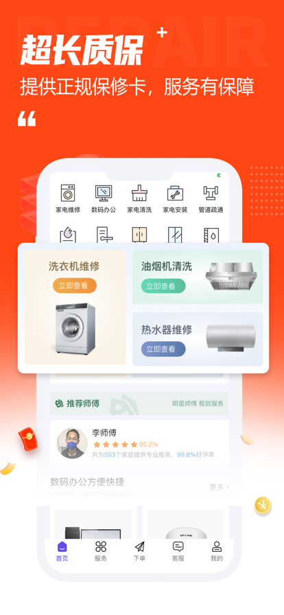 邻家快修是领先的O2O上门服务平台,提供家电维修、安装、清洗、管道疏通、防水补漏、墙面翻新、厨卫改造、开锁换锁、门窗维保、手机电脑维修等,具体涵盖近百种维修服务品类。邻家快修旨在为用户提供优质的生活解决方案,业务覆盖2200+县级以上城市,是您身边的家电维修管家。平台服务标准严格、价格透明,只需轻松预约,服务随叫随到,线上和电话客服帮您解决问题。 平台优势: 【服务靠谱】服务质量问题,保修期内,师傅免费上门,全责保修; 【全国覆盖】300万+专业师傅,覆盖600城市3000区县40000乡镇,全国服务无盲区; 【快速响应】下单快、接单快、报价快,随叫随到,专享高效上门服务; 【价格公道】低于市场均价15% ; 【免费入驻】注册登录即可下单; 【平台担保】所有服务一口价,没有恶意报价、加价、抬价 行为,坚决维护商家合法权益; 【全程监控】平台自主研发订单处理系统,对每一笔订单 来源、去向、完成程度等信息严格跟进,实现订单实时监控,为交易安全保驾护航; 【服务守护】客服7*24小时在线,师傅全天待命,不论何时下单、遇到任何难题,平台第一时间响应,为您服务; 【专业售后】订单问题、服务纠纷、财产损失,无需等待, 轻松申请先行赔付; 【质保无忧】所有服务均享受一年质保,因服务问题导致产品故障,免去上门检修费;因师傅原因需要二次上门,奇兵到家负责到底; 服务项目: 【家电维修】空调维修、洗衣机维修、热水器维修、冰箱维修、电视机维修、燃气灶维修、油烟机维修等电器维修服务。 【家电清洗】油烟机清洗、热水器清洗、燃气灶清洗、空调清洗、冰箱清洗、洗衣机清洗、电烤箱清洗、微波炉清洗、饮水机清洗、灶台清洗、地暖清洗等服务。 【家电安装】空调安装、空调移机、冰箱安装、洗衣机安装、电视安装、热水器安装、燃气灶安装、油烟机安装、厨房电器安装、生活电器安装等服务。 【管道疏通】下水道疏通、洗菜盆疏通、洗手盆疏通、蹲便疏通、马桶疏通、地漏疏通、浴缸疏通、大型管道疏通、水管清洗等服务。 【家具维保】家电拆装、家具维修、家具翻新等服务。 【开锁换锁】开锁、活锁、修锁、装锁等服务。 【水电维修】灯具维修、水管维修、电路维修等。 【房屋修缮】防水补漏、墙面刷新、瓷砖美缝、厨卫改造等服务。 服务优势: 【快速响应】全城覆盖,上千名服务人员,从预约到上门服务,快至30分钟; 【专业认证】服务人员实名认证;每周专对服务人员进行专业培训,服务质量专业有保证; 【便宜实惠】每个行业我们都精心做到明码标价,杜绝乱收费。低价不低质,真正做到平民的消费,尊属的享受。 联系我们: 您在使用中有任何的问题或建议都可以通过以下方式联系即刻修: 服务热线:400-696-2629