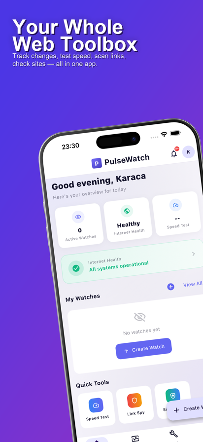 PulseWatch 把混乱的网络变成一块平静的仪表盘。追踪任意网页的变化、测试网速、检查可疑链接、评估站点健康、监控你依赖的服务的实时状态 — 全部在一个简洁优雅的主屏幕里完成。 30 秒监控任意网站 选择页面、告诉我们要追踪什么,AI 选择器会自动搞定其余的一切。无需代码、无需 CSS、无需折腾。适合降价提醒、补货提醒、内容更新、新职位、抽奖结果、考试成绩,以及任何你本来要手动刷新的东西。 网速测试 Cloudflare 提供的下载、上传与真实 ping。精美的动画仪表、完整的历史记录、准确的结果 — 随时随地,任何网络。 链接侦察 — 点之前就知道 粘贴任何短链接或可疑链接,立刻看到它指向哪里。跟踪每一次跳转、检查 SSL 证书、识别钓鱼风险 — 点击前先做决定。适合电子邮件、短信链接、二维码以及奇怪的私信。 几秒完成站点体检 几秒内获得任意 URL 的完整报告:加载时间、HTTP 状态、SSL 详情、安全头部以及可信赖的综合评分。专为开发者、设计师、SEO 与站长打造。 是否宕机? GitHub、AWS、Cloudflare、Vercel、OpenAI、Discord、Slack 等数十个服务的实时状态 — 包括你自己的自定义服务。出问题的瞬间就知道,免得先去 debug 自己的代码。 全球脉搏 — 全球视角 覆盖全球 8 个地区的互联网健康全景。一发生故障立即捕捉,立刻判断是只有你、你的国家,还是全世界。 像素级变化检测 带 diff 和截图的完整变更历史、百分比降价、智能去重以及实时推送通知。支持 Apple Watch 与主屏幕小组件。 PulseWatch 为所有人打造 — 追折扣的购物达人、监控自家技术栈的开发者、关注依赖的 SRE、追踪竞争对手的市场人员、关注公共记录的记者,以及单纯好奇的你。免费开始。需要时再升级 Pro。无追踪、无广告、无废话。 今天就下载 PulseWatch,让网络主动来找你。
